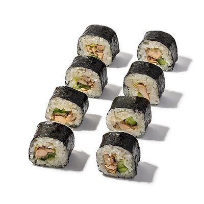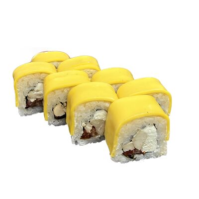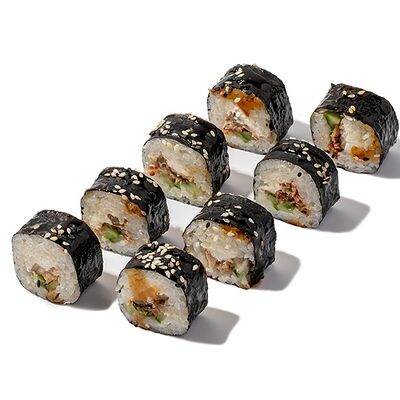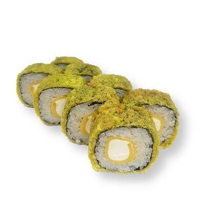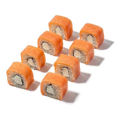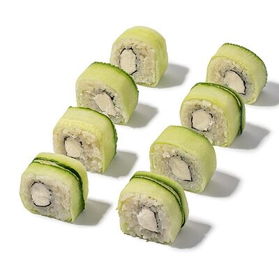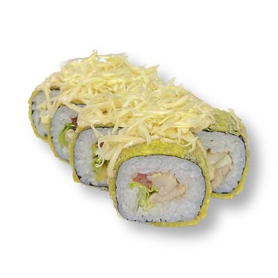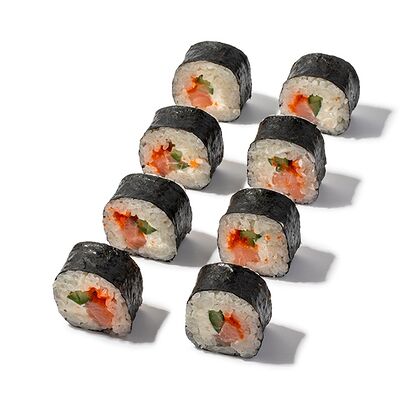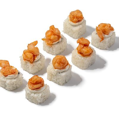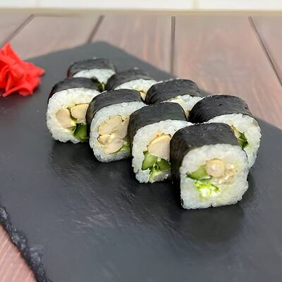 Рис, креветки, сыр творожный, икра масаго, огурец, васаби, имбирь, соевый соус (4 шт.)