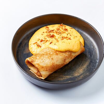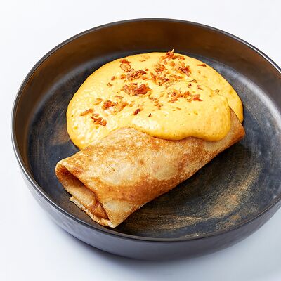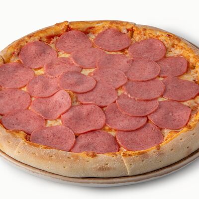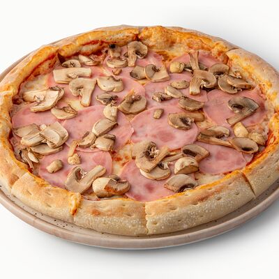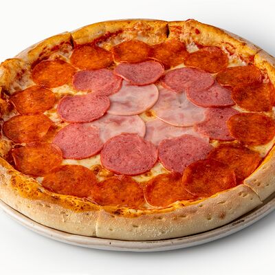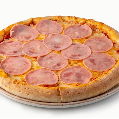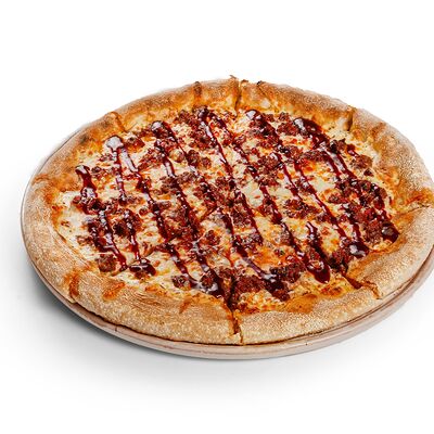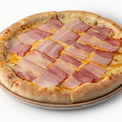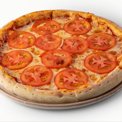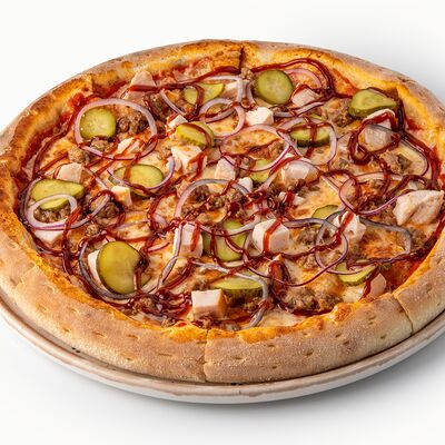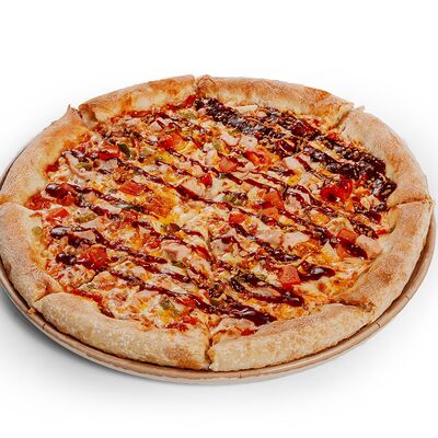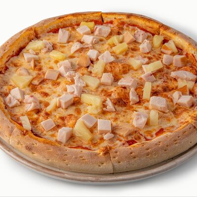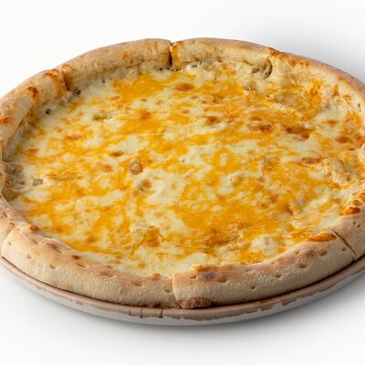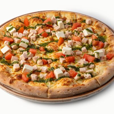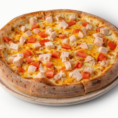 Соус белый для пиццы, куриная копченая грудка, помидоры, сыр моцарелла, сыр пармезан, сыр топпинг Чеддер