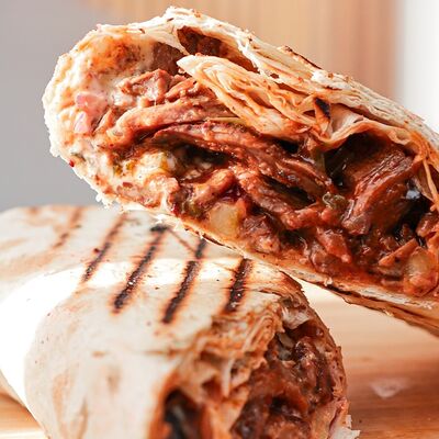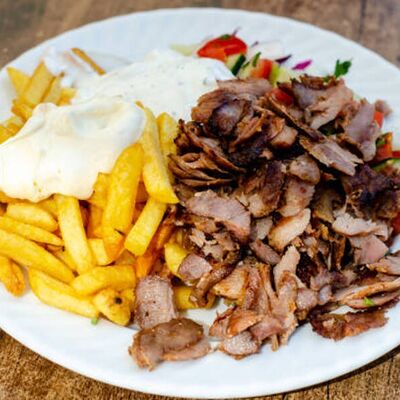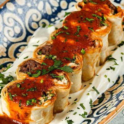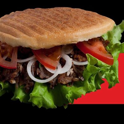 Говядина, помидор, огурцы, фирменный шашлычный соус, фирменный белый чесночный соус, лист салата, лаваш