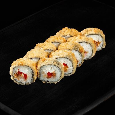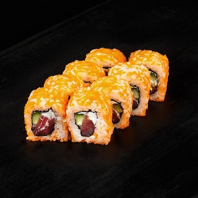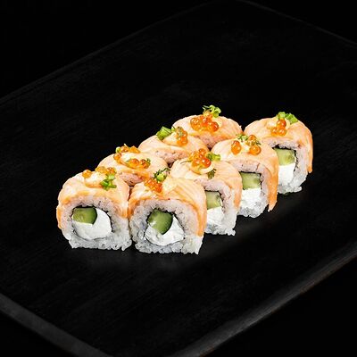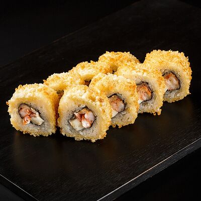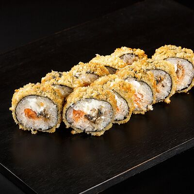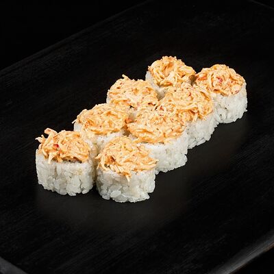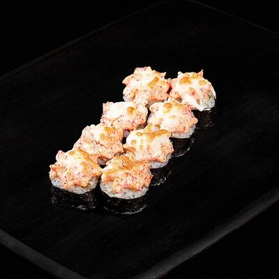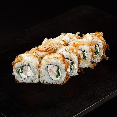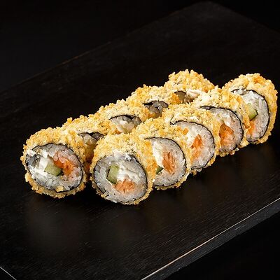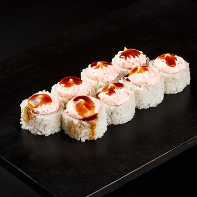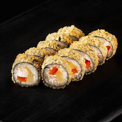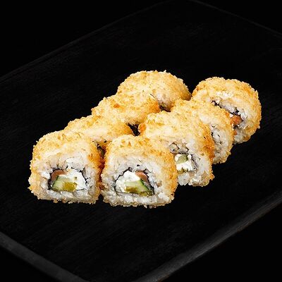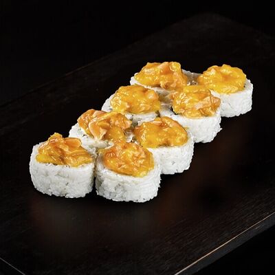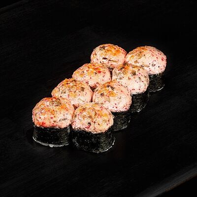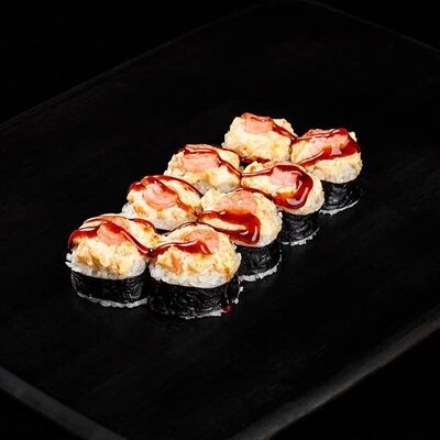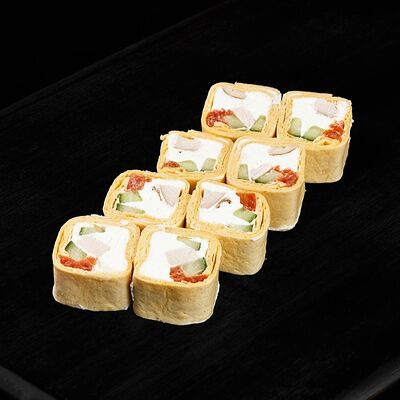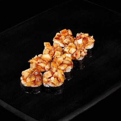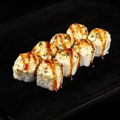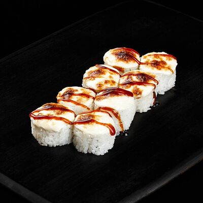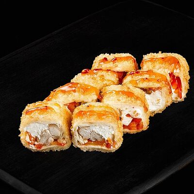 Запечённый в гриле ролл с поджаренной курочкой, сыр моцарелла, сливочный сыр, огурец и соус Яки. Если вам не хочется рыбы