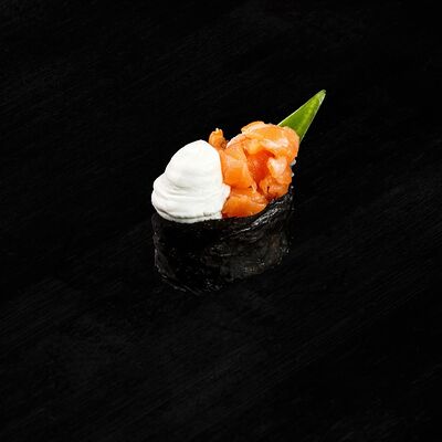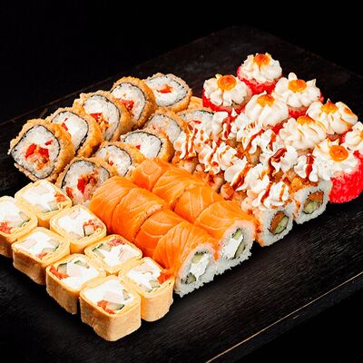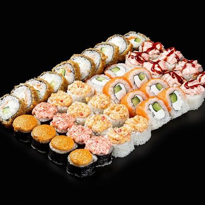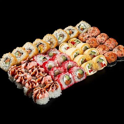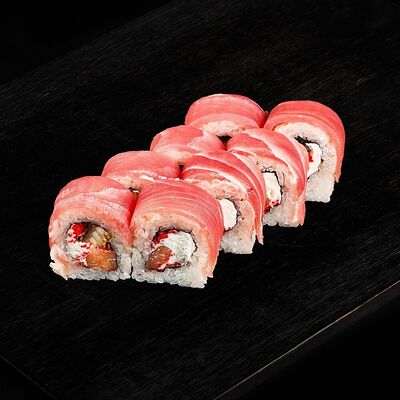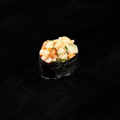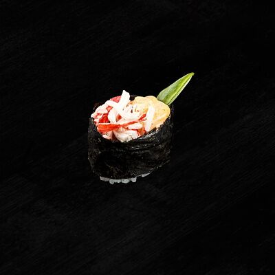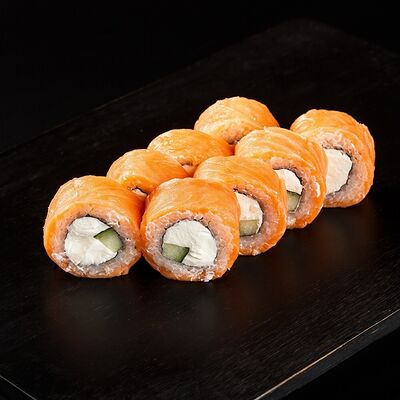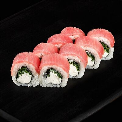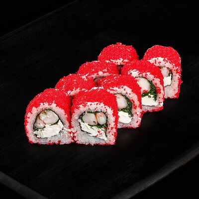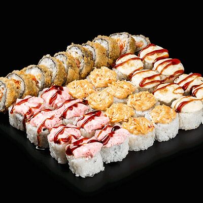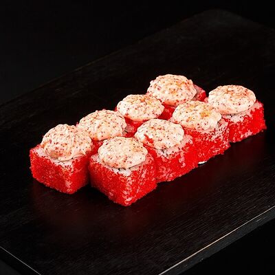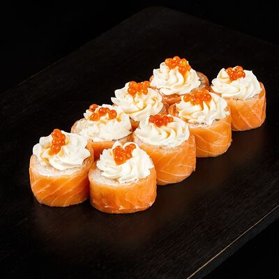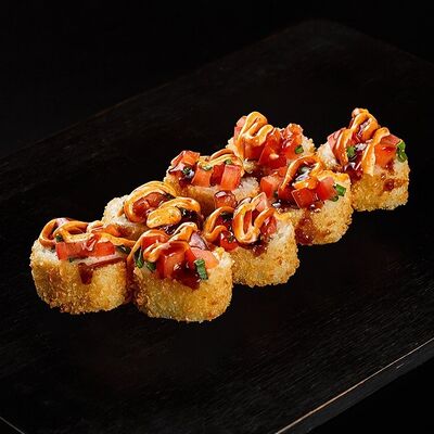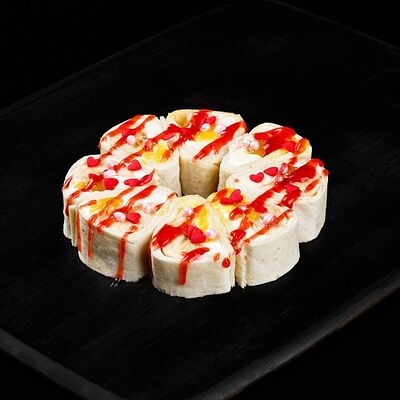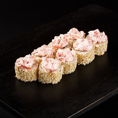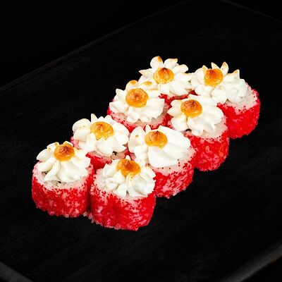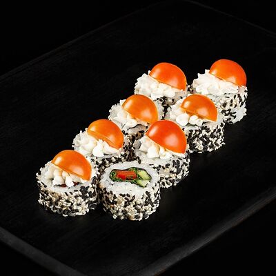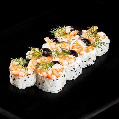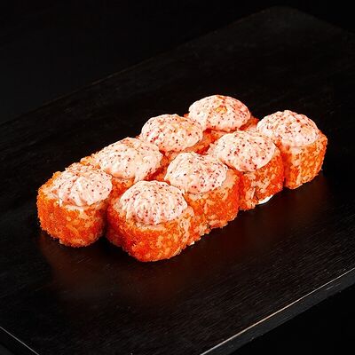 Запечённый в гриле ролл с поджаренной курочкой, сыр моцарелла, сливочный сыр, огурец и соус Яки. Если вам не хочется рыбы