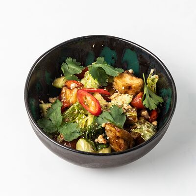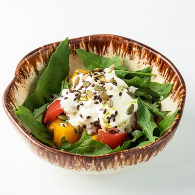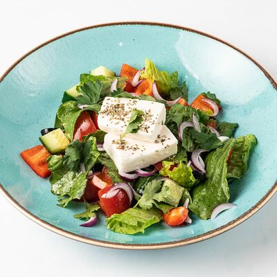 Огурцы, перец болгарский, помидоры азербайджанские, салат романо, лук красный, кинза, петрушка, маслины консервированные, сыр чанах, балканская заправка, орегано