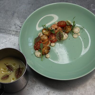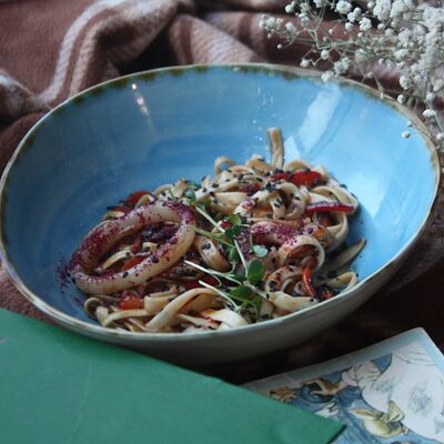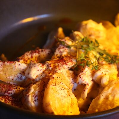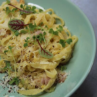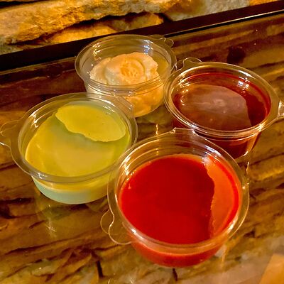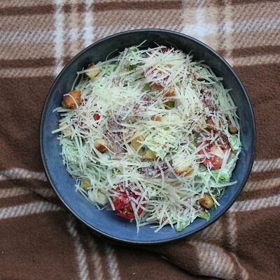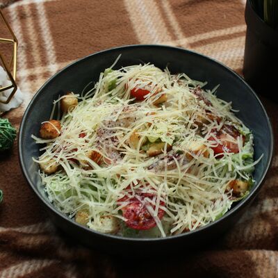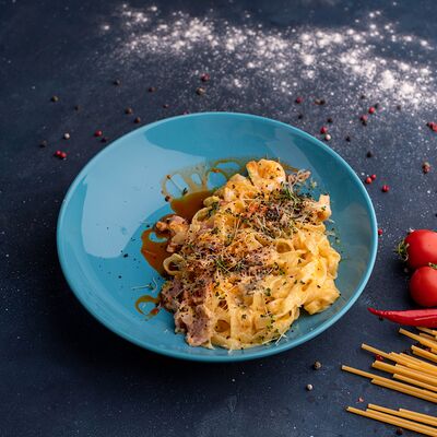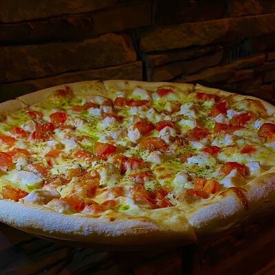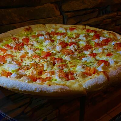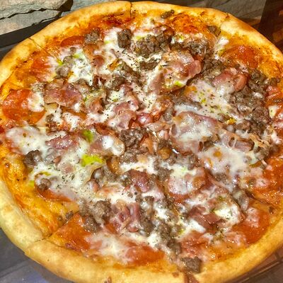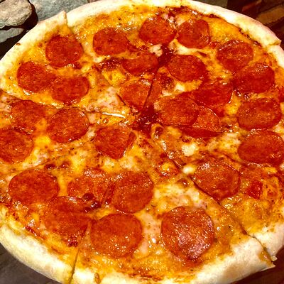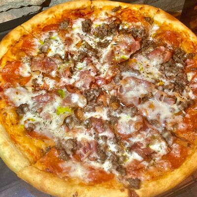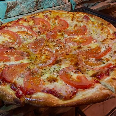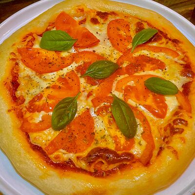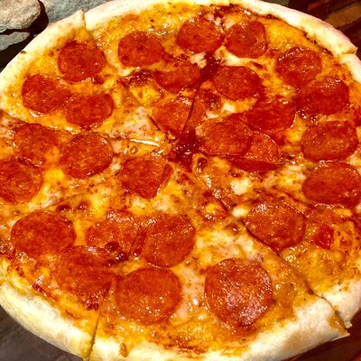 Тесто для пиццы, сыр моцарелла, колбаски пепперони, фирменный томатный соус