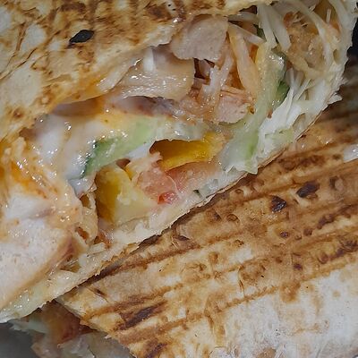 Булка чиабатта, шеф-соус, помидоры, огурцы, курица гриль