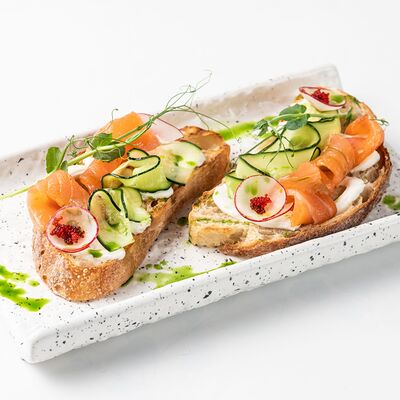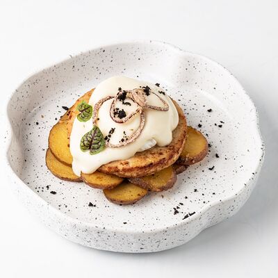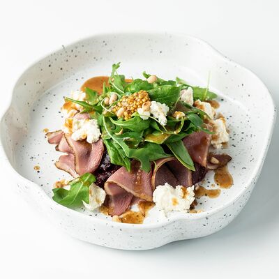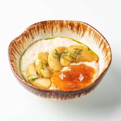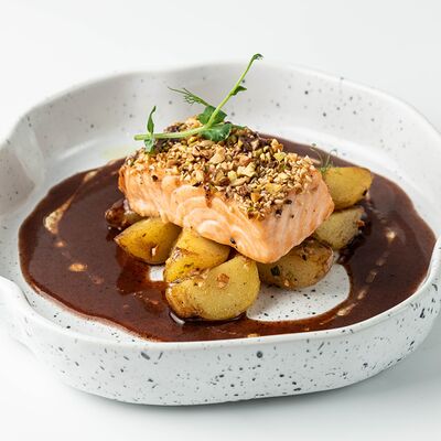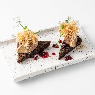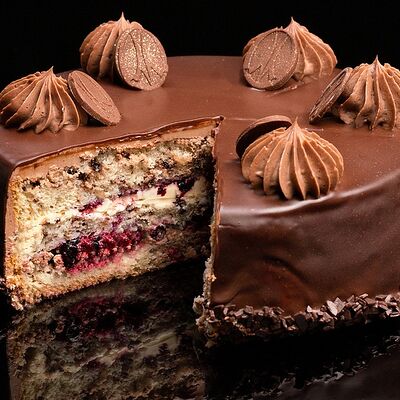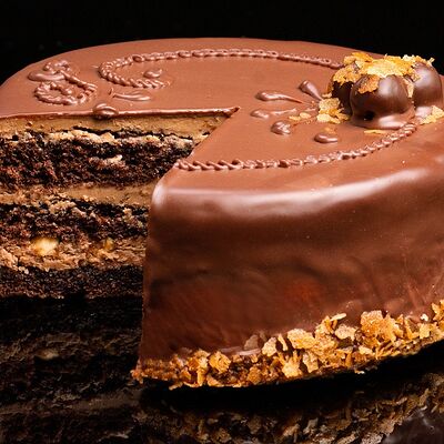 Шоколадный бисквит, пропитанный абрикосовым сиропом с ликером амаретто, заварным кремом с вареным сгущенным молоком и какао, дробленым фундуком. Покрыт шоколадной помадкой