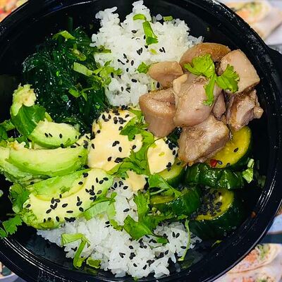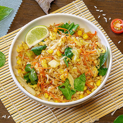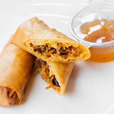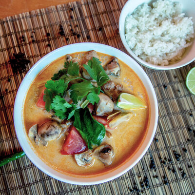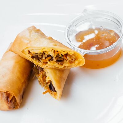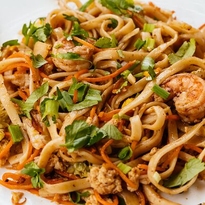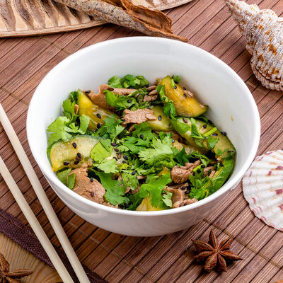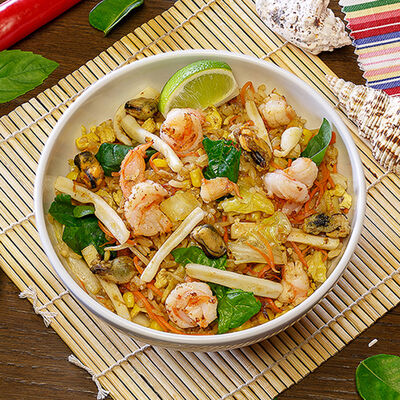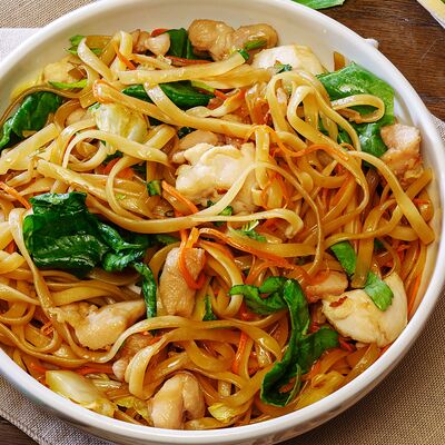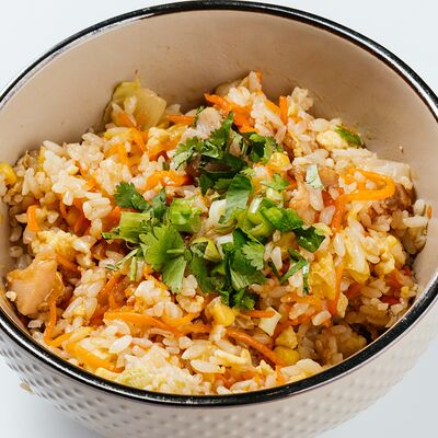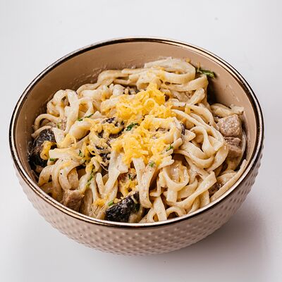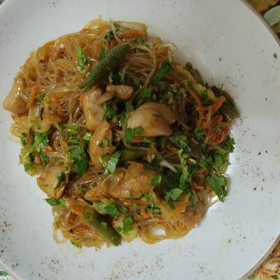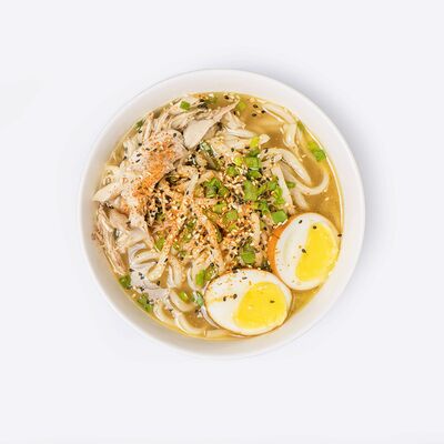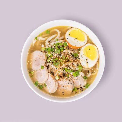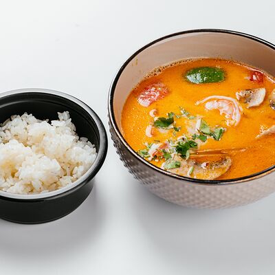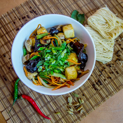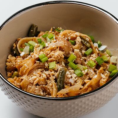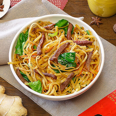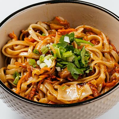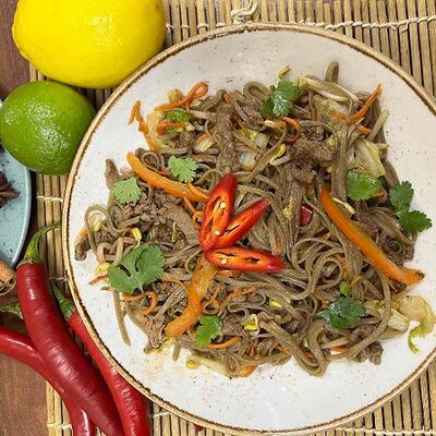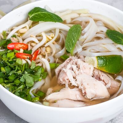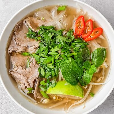 Фирменный бульон (курица, имбирь, шампиньоны, корица), рисовая лапша, говядина, зелень, репчатый лук, ростки сои, перец чили, лайм