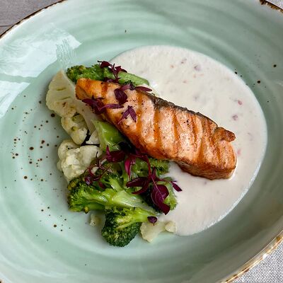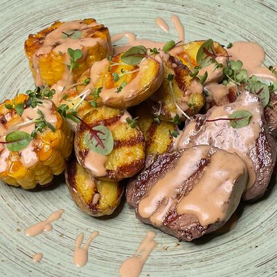 Говяжья вырезка, кукуруза гриль, соус демиглас, масло оливковое, чеснок, молодой картофель