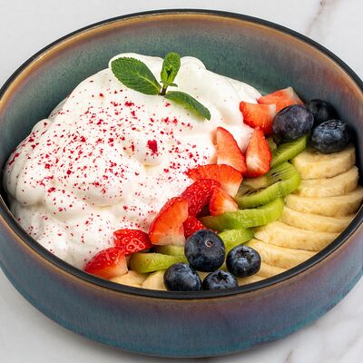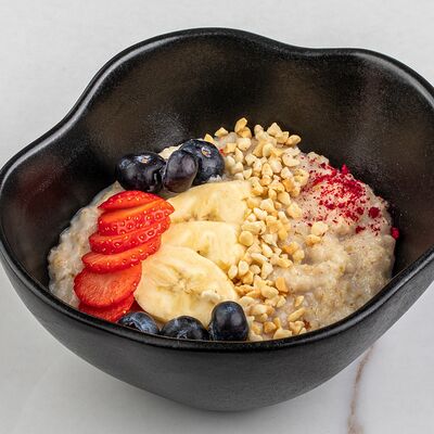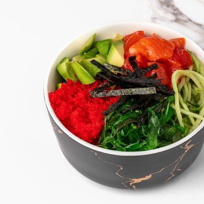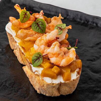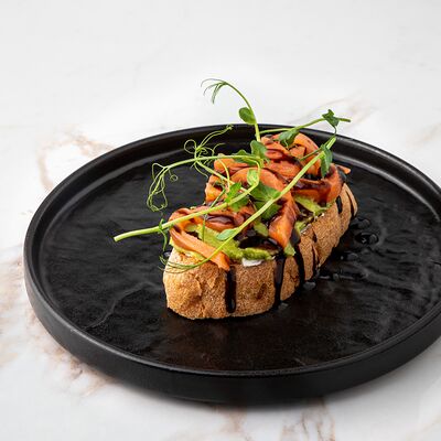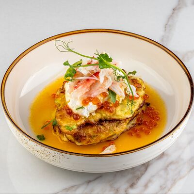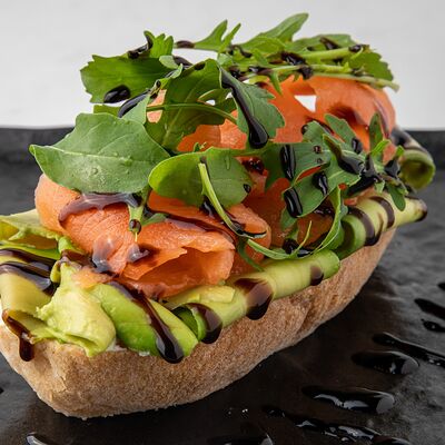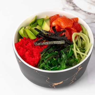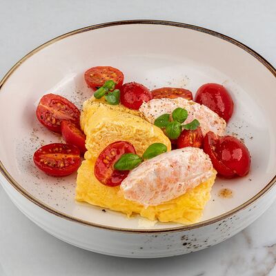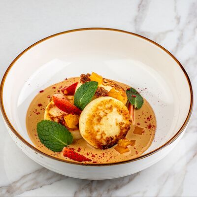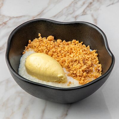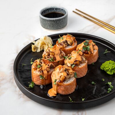 Рис, сыр творожный, опалённый лосось, хрустящая карамель, клубника