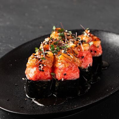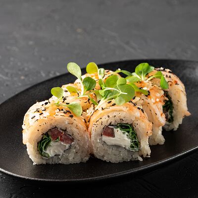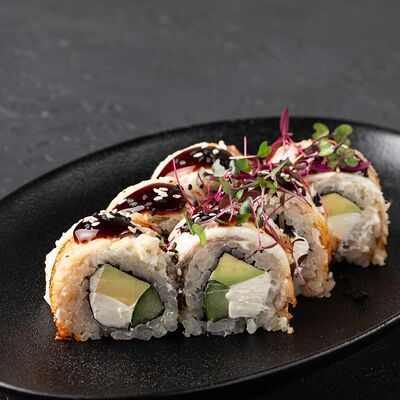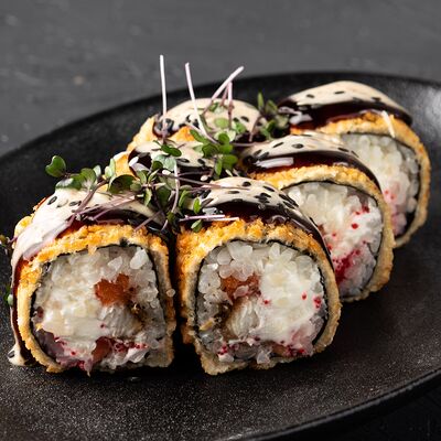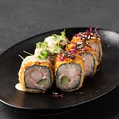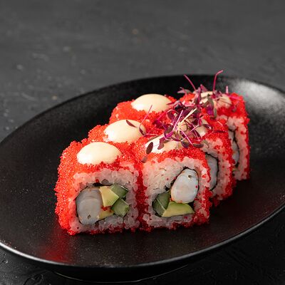 Ролл с хрустящей икрой летучей рыбы, мясистой креветкой, нежным авокадо и огурчиком, приправленный тайским соусом