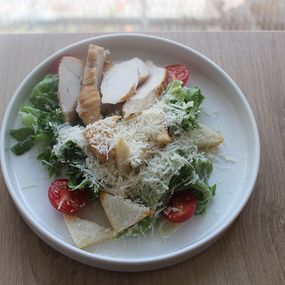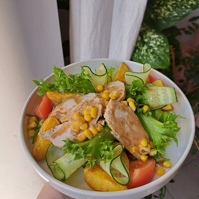 Сыр гауда, огурец, томат, салат фриллис, соус цезарь, хлеб пшеничный, картофель фри
