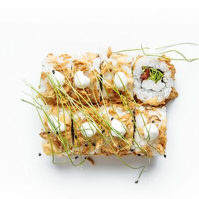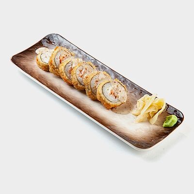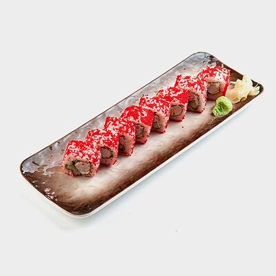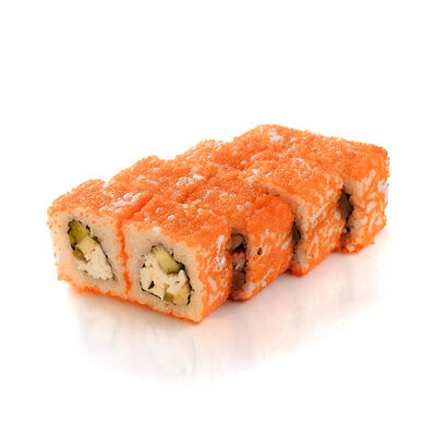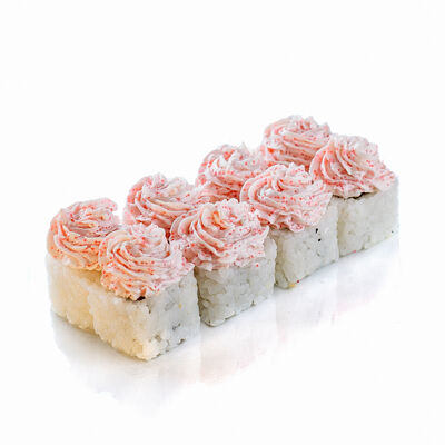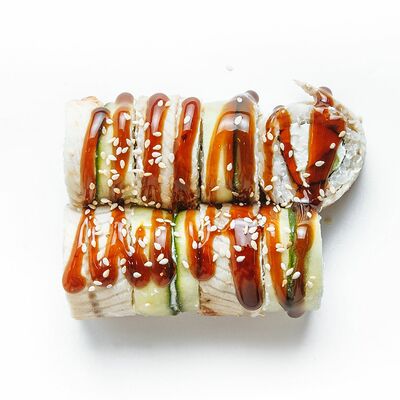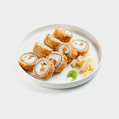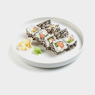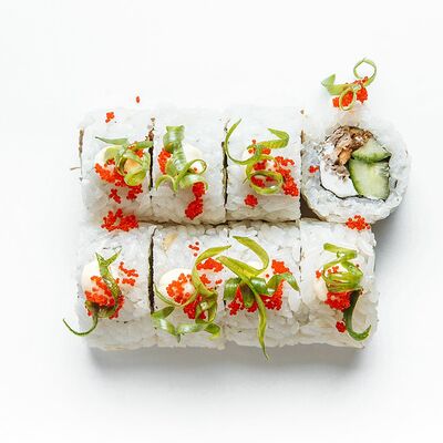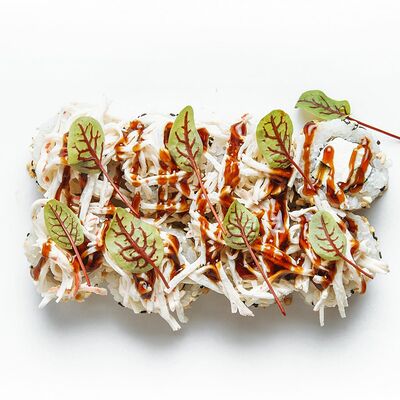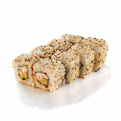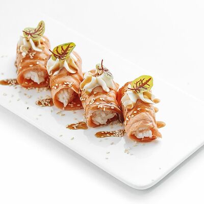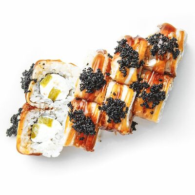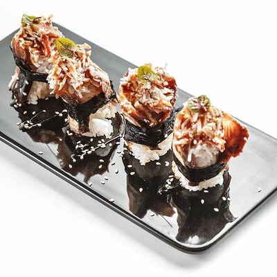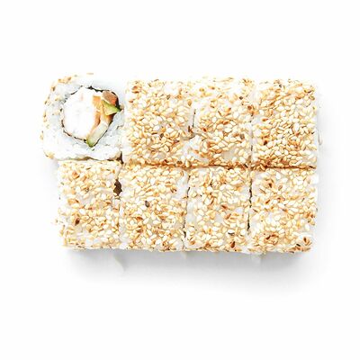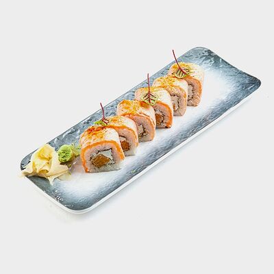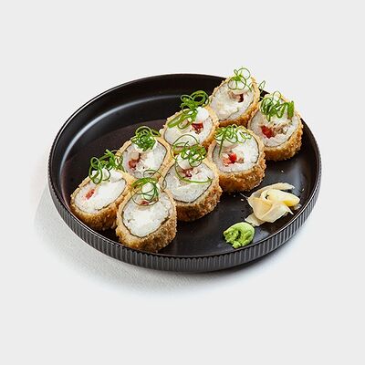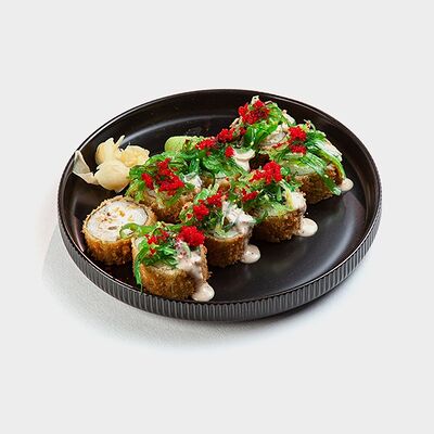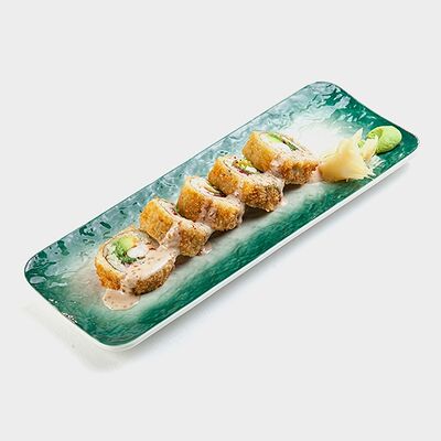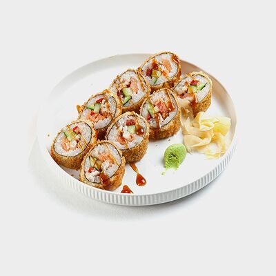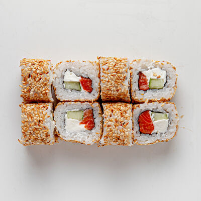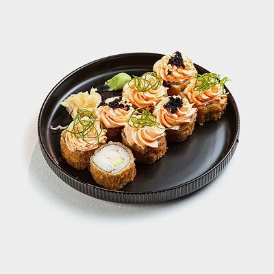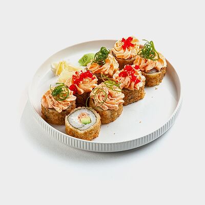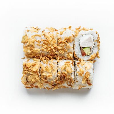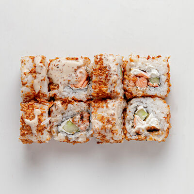 Рис, огурец, лосось терияки, лук фри, сливочный сыр, ореховый соус