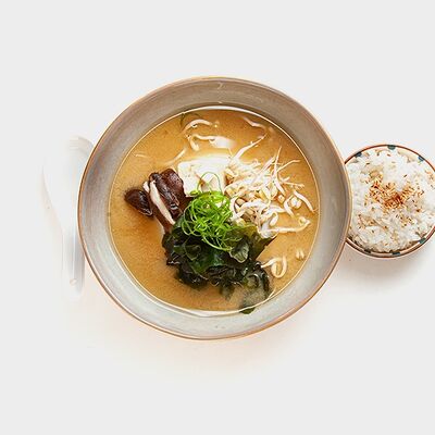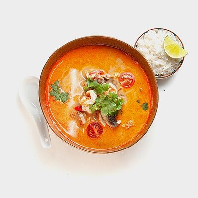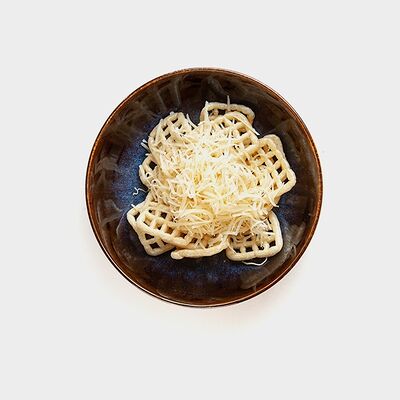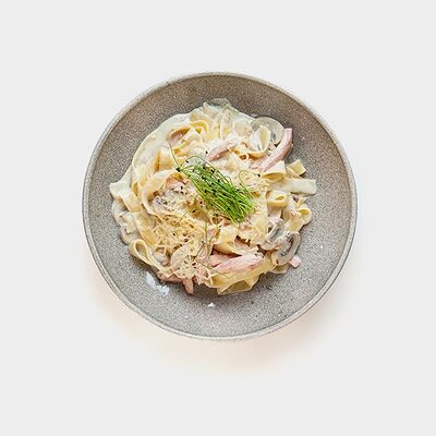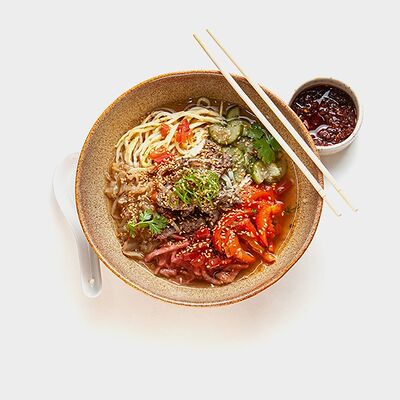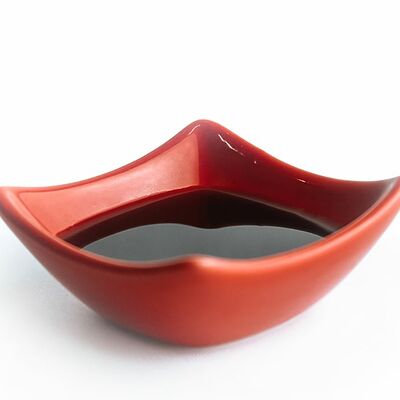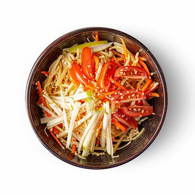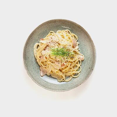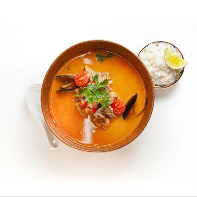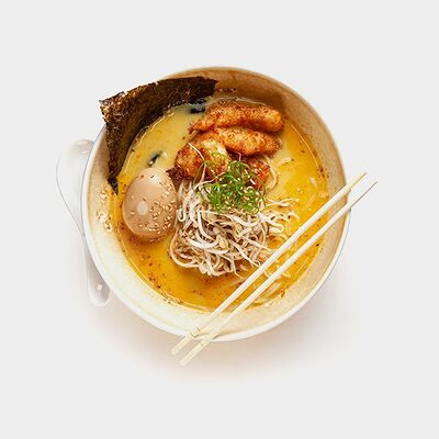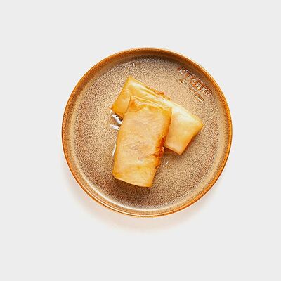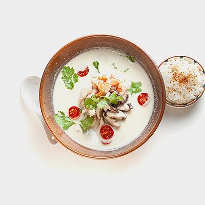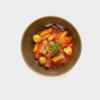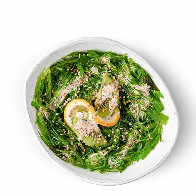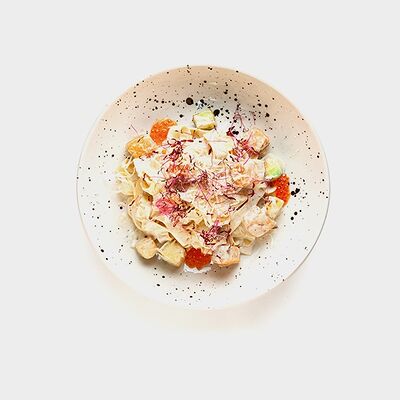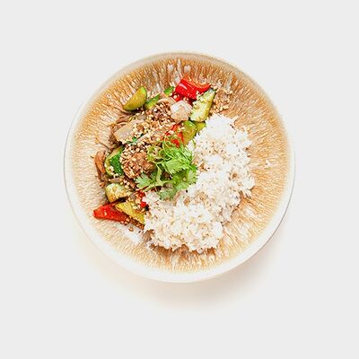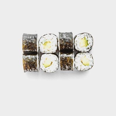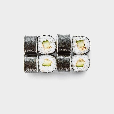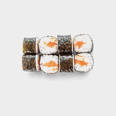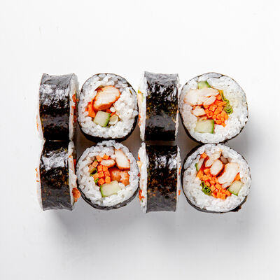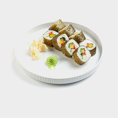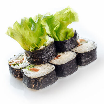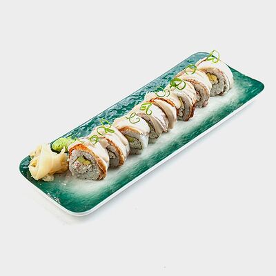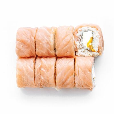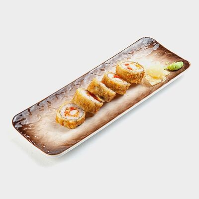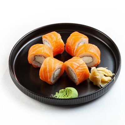 Рис, огурец, лосось терияки, лук фри, сливочный сыр, ореховый соус