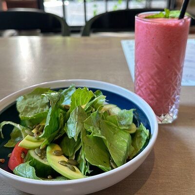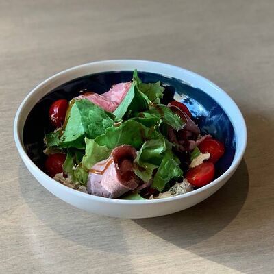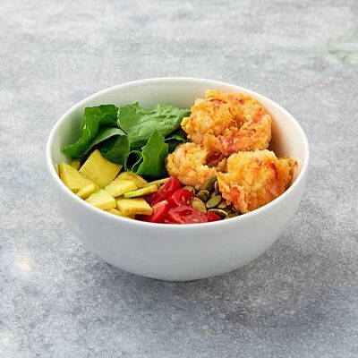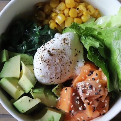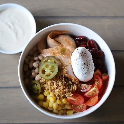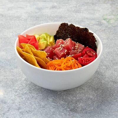 Рис или киноа (на выбор), тунец, начос, имбирь маринованный, нори, морковь по-корейски, авокадо, томаты черри, кунжут, соус хоттагер