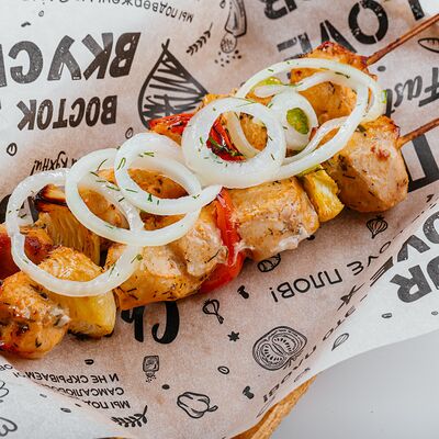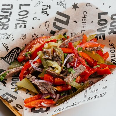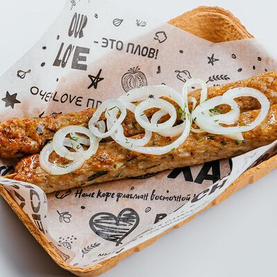 Лаваш армянский, кебаб из говядины, салат орзу, лук красный, огурец маринованный, кетчуп томатный
