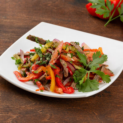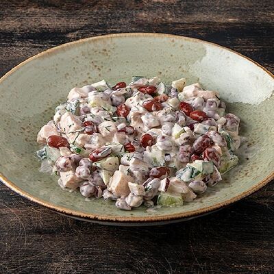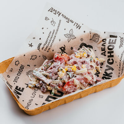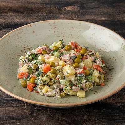 Ветчина, маринованный огурец, картофель, лук репчатый, морковь, майонез, соль, перец, зелень