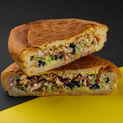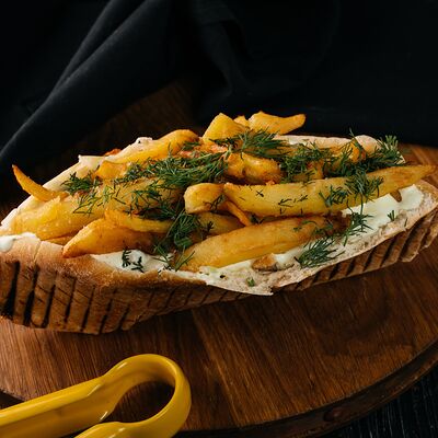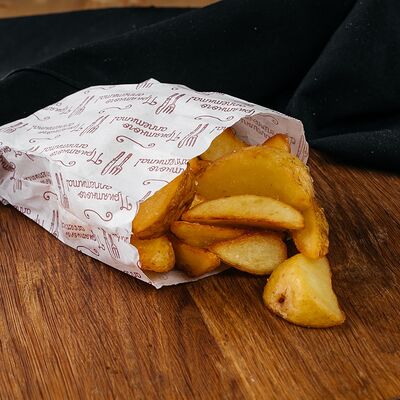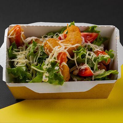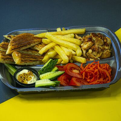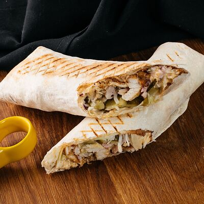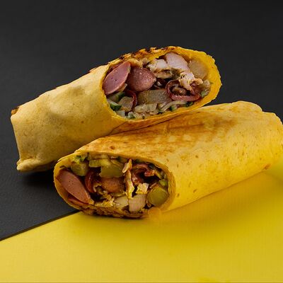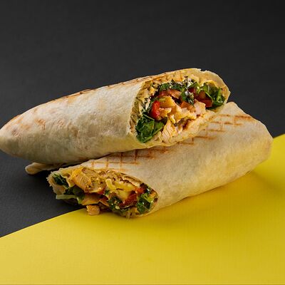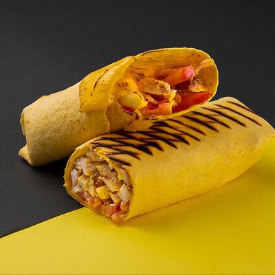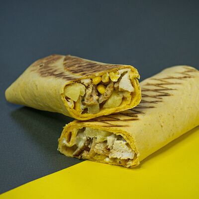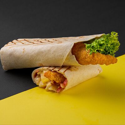 Сырная тортилья, картофель фри, сочная курочка, помидор, соус цезарь, сыр Чеддер