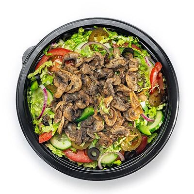 Легкий сэндвич с шампиньонами, обжаренными в масле с луком, свежие овощи и соус на выбор на свежевыпеченном хлебе