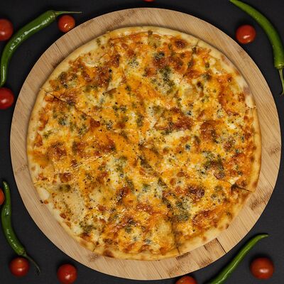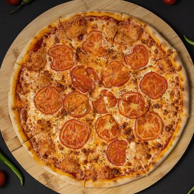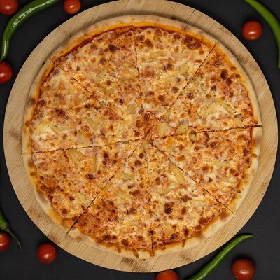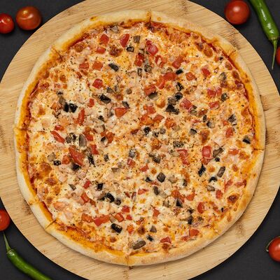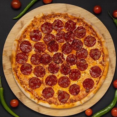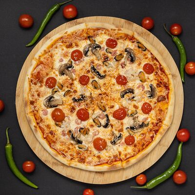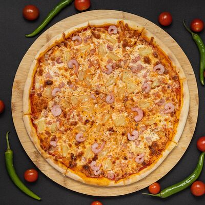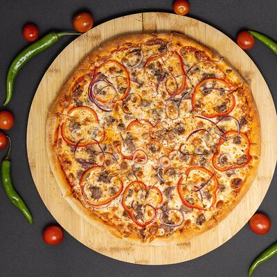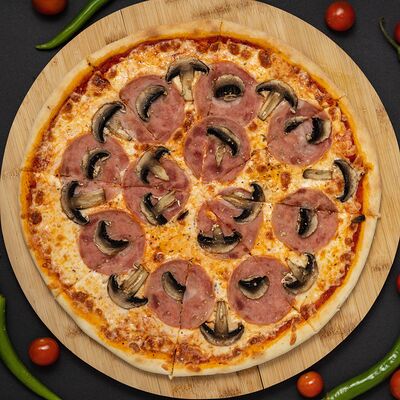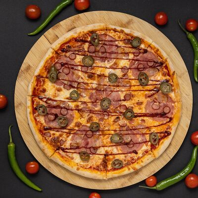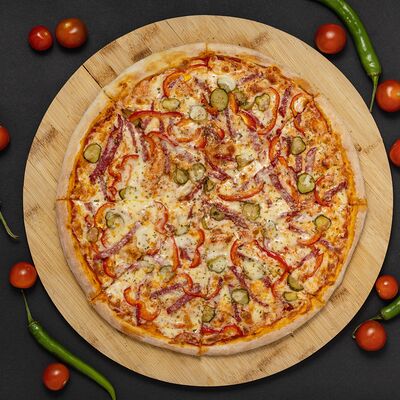 Тесто, соус, сыр, ветчина, охотничье колбаски, бекон, перец болгарский, халапеньо, огурец маринованный (36 см)