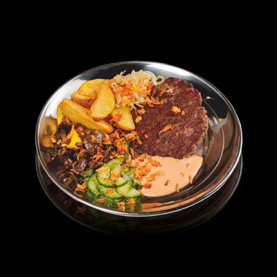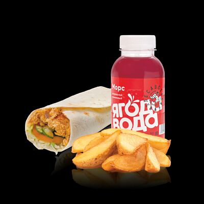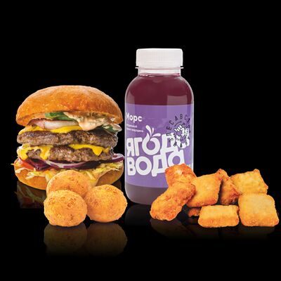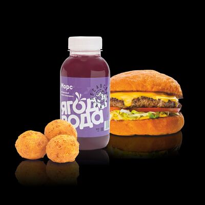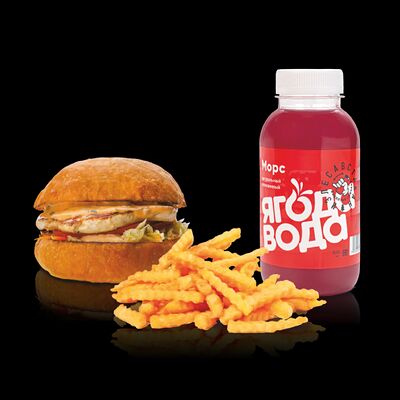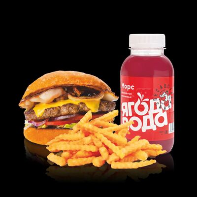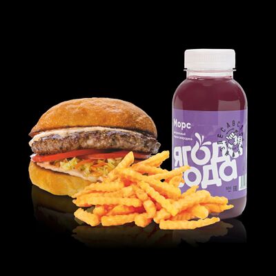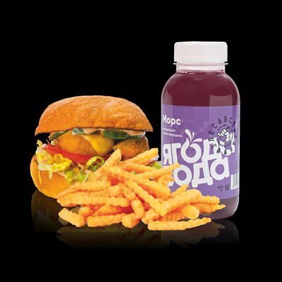 Бургер Электрон, картофель фри или дольки, морс собственного приготовления на выбор