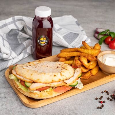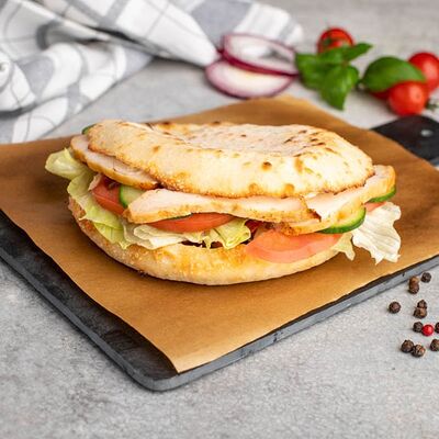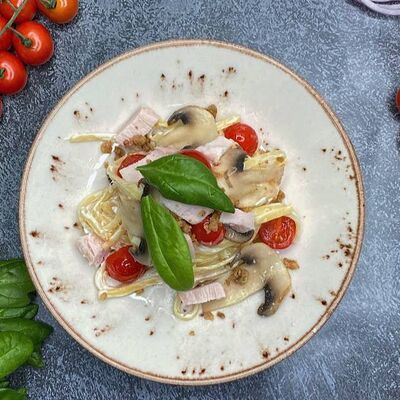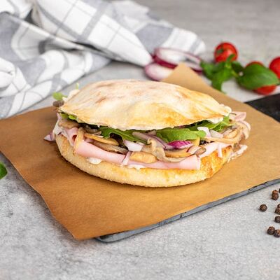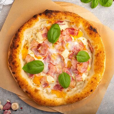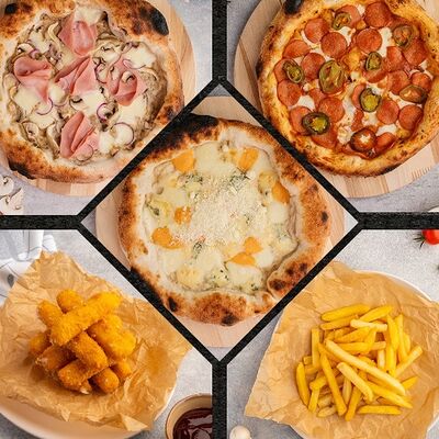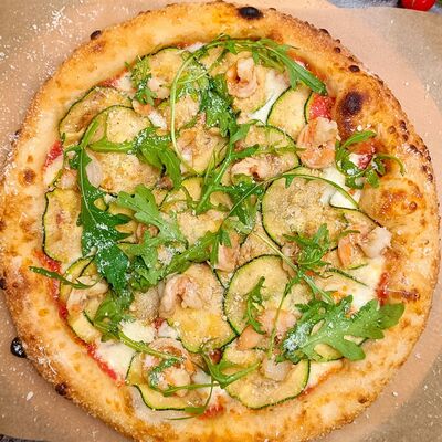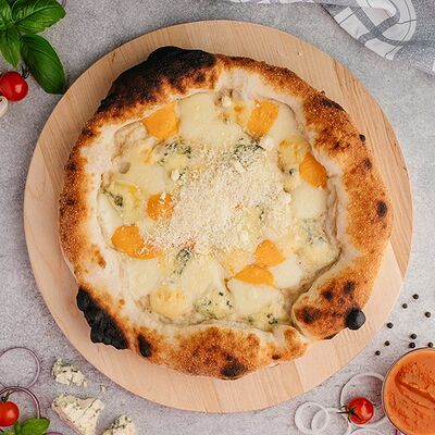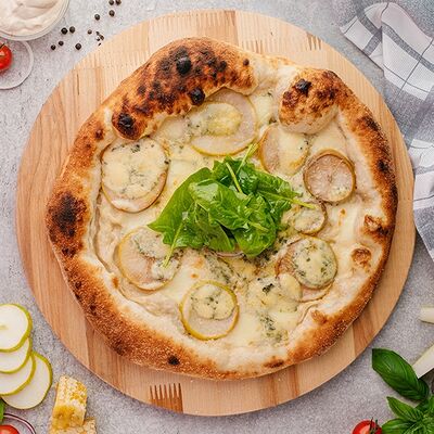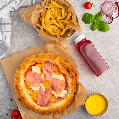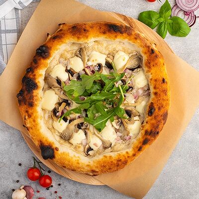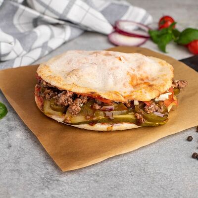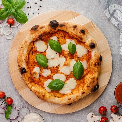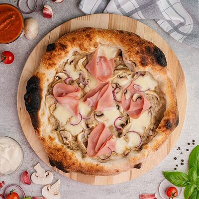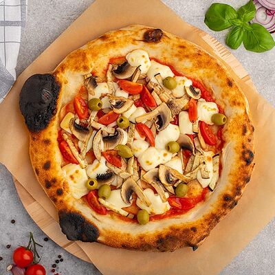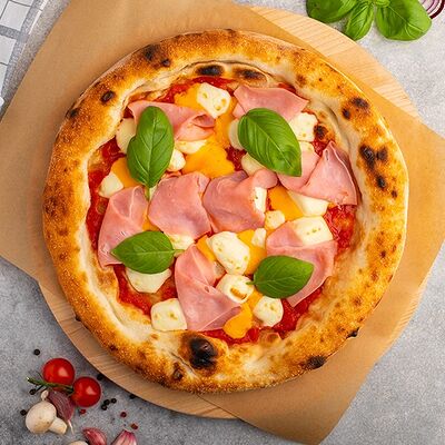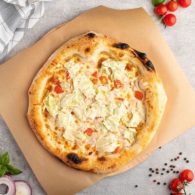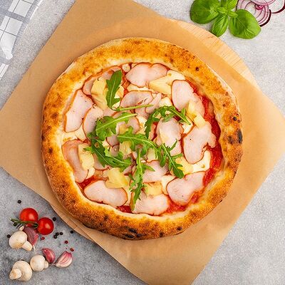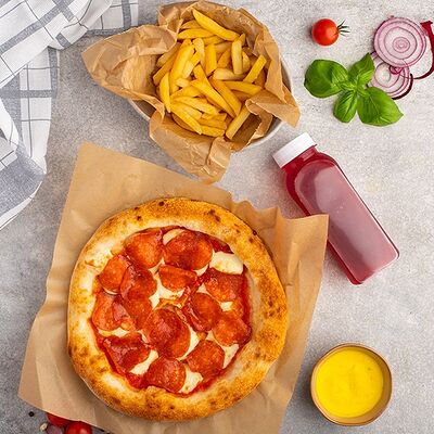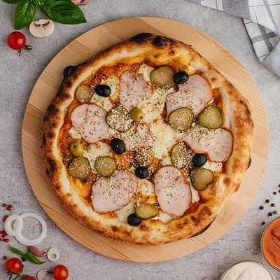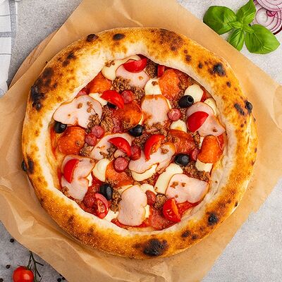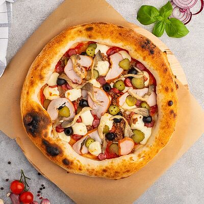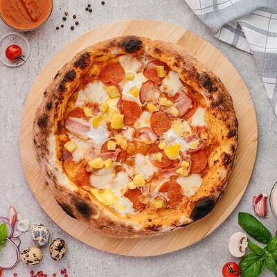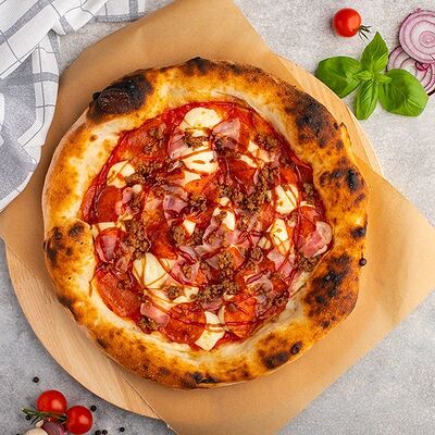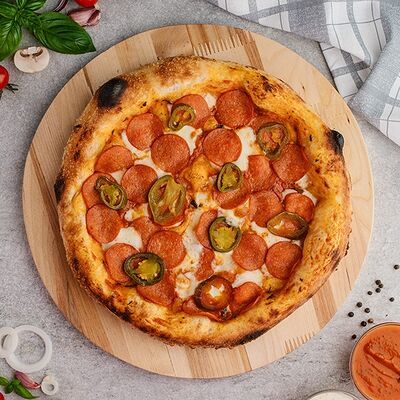 Тесто для пиццы, соус томатный, колбаски пеперони, перец халапеньо, моцарелла (28 см)