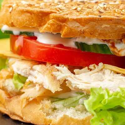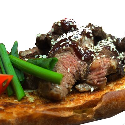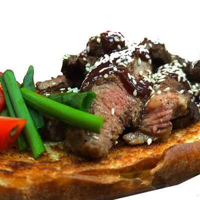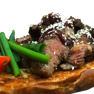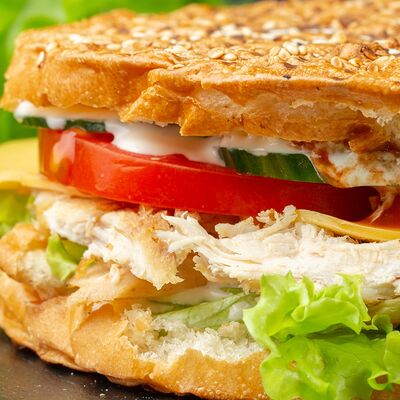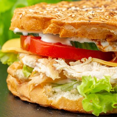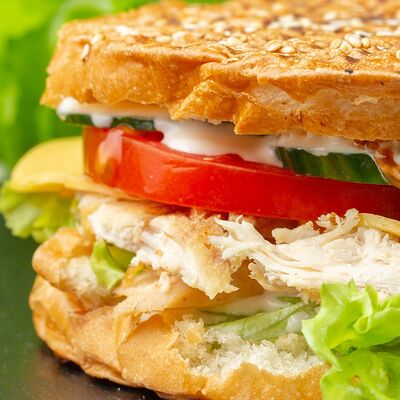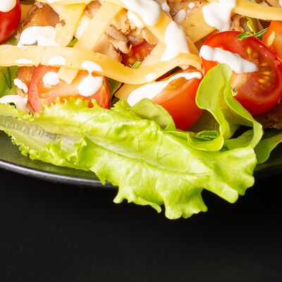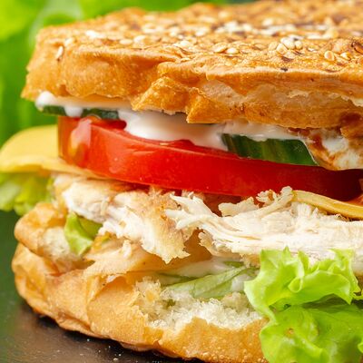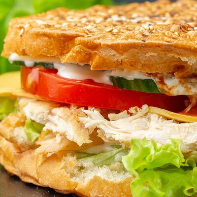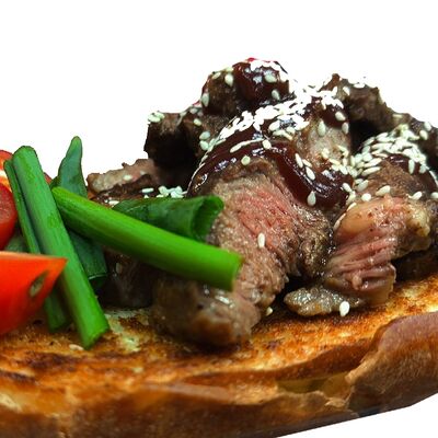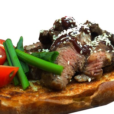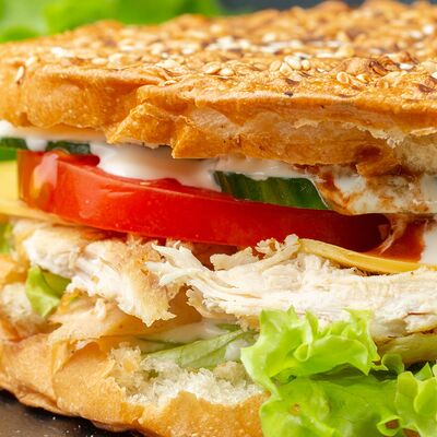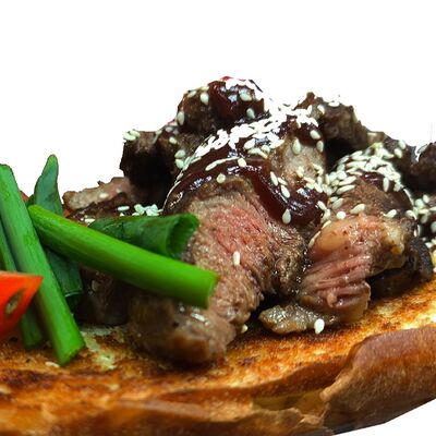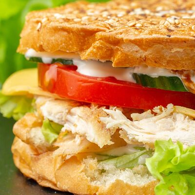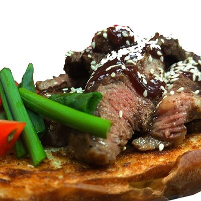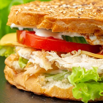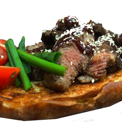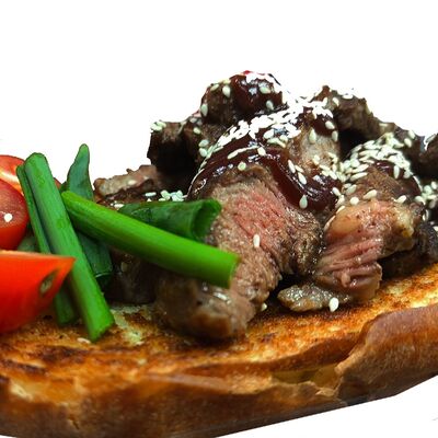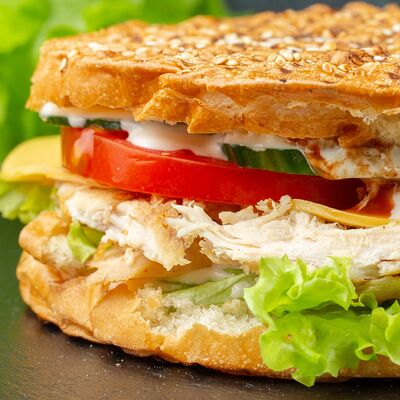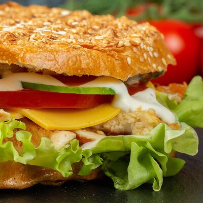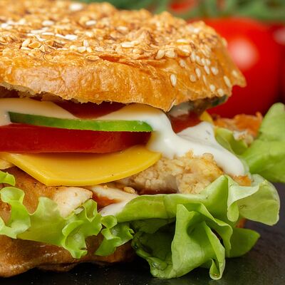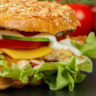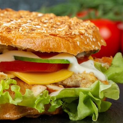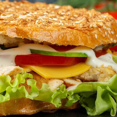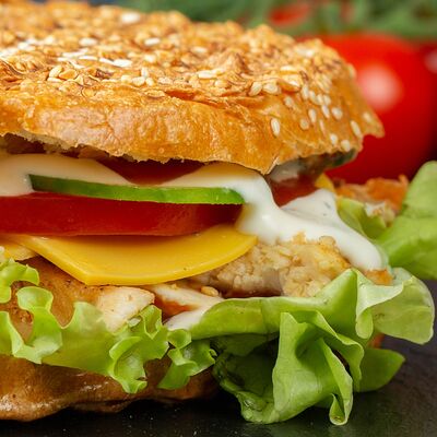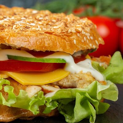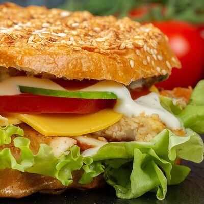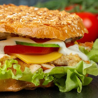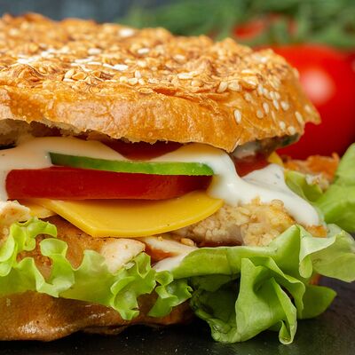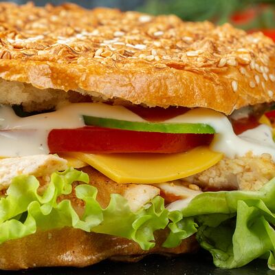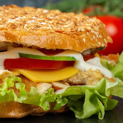 Сочная большая мясная котлета на огне, на выбор, хрустящая натуральная булочка, кисло-сладкий соус, спелый ананас, сыр Чеддер премиум качества, свежие овощи (красный лук, томат, лист салата, маринованный огурчик), густой чесночный соус