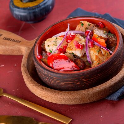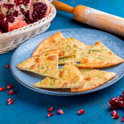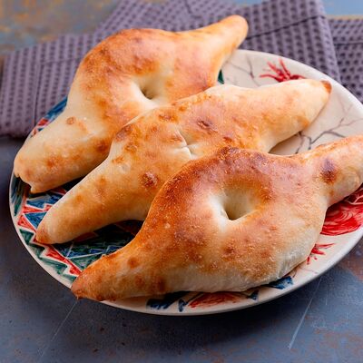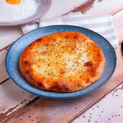 Свежеиспеченная лепешка из слоеного теста квадратной формы с тягучим сыром сулугуни внутри, при подаче смазывается топленым маслом