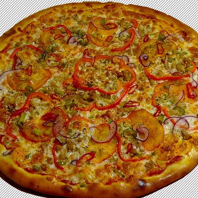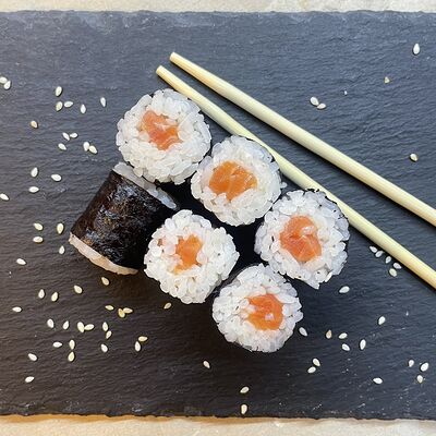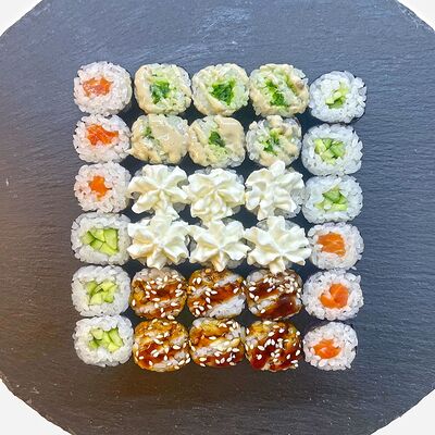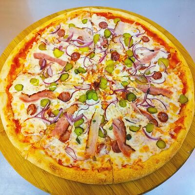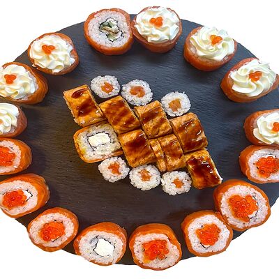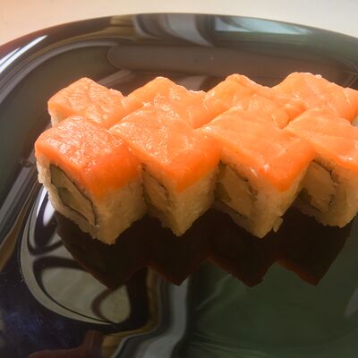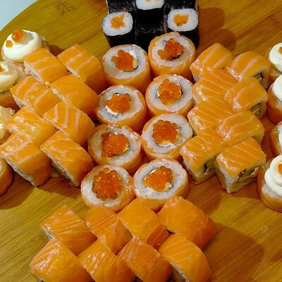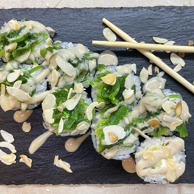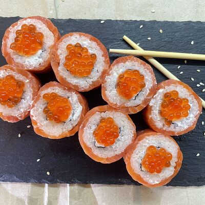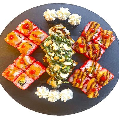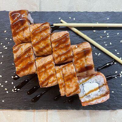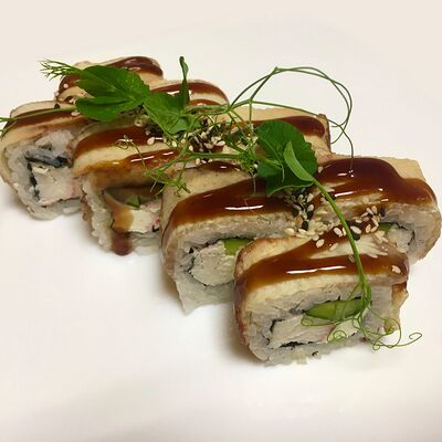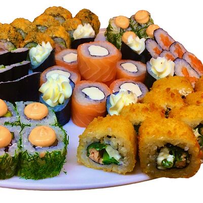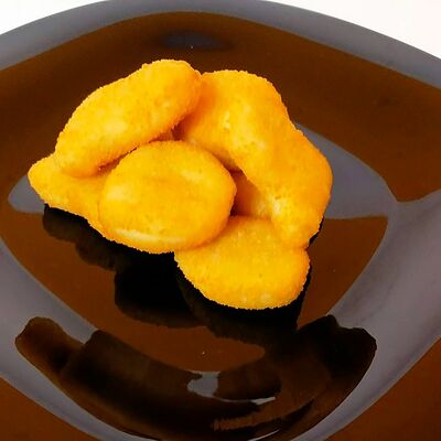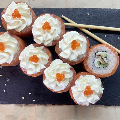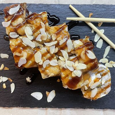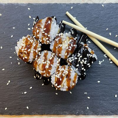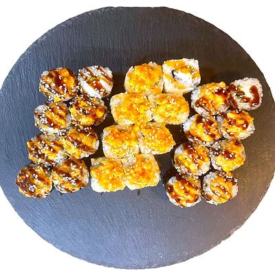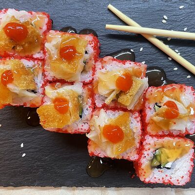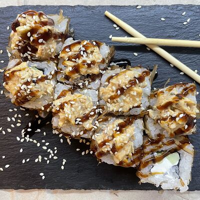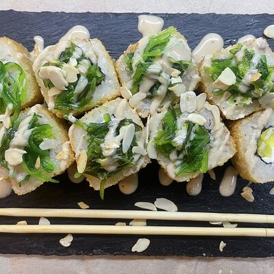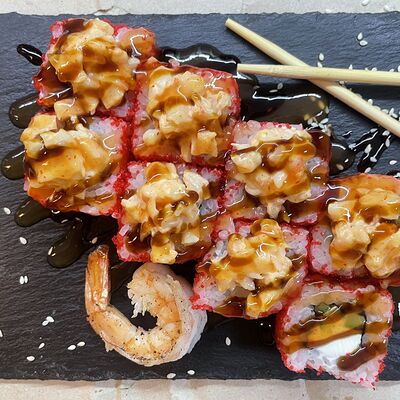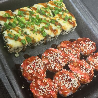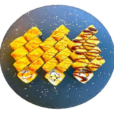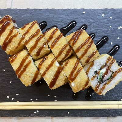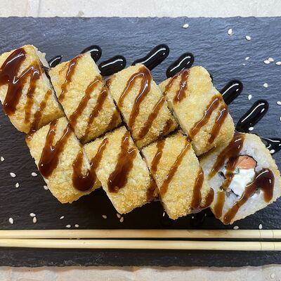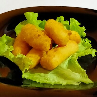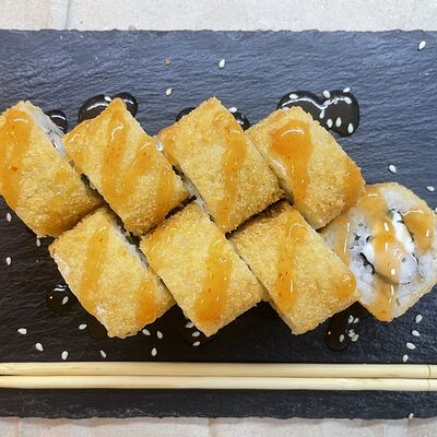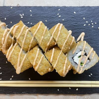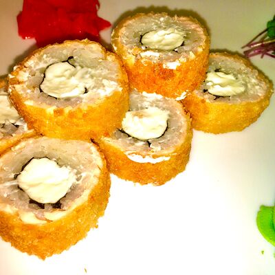 Рис, сыр, лук зелёный, курица холодного копчения, кляр, сухари, спайси-соус