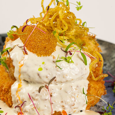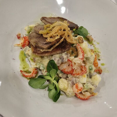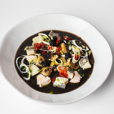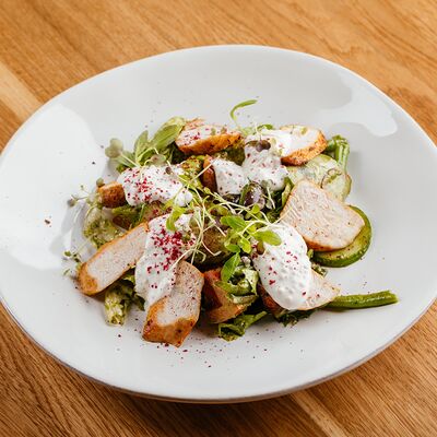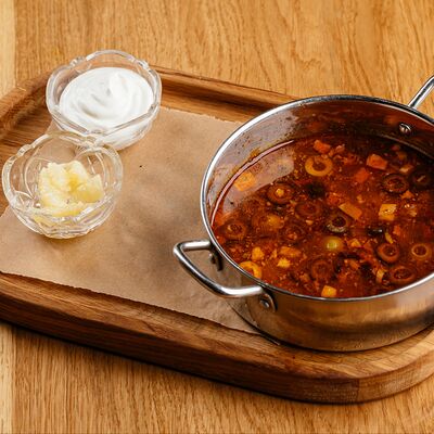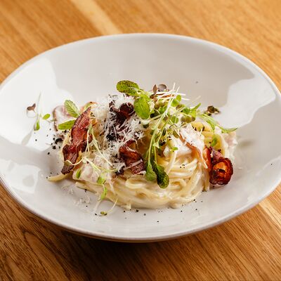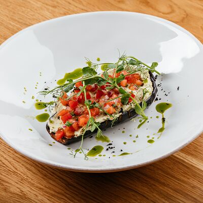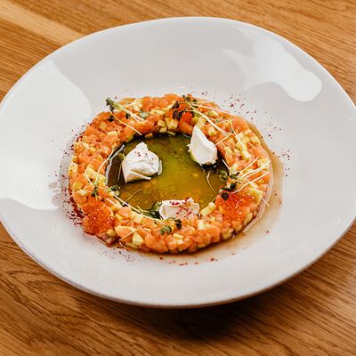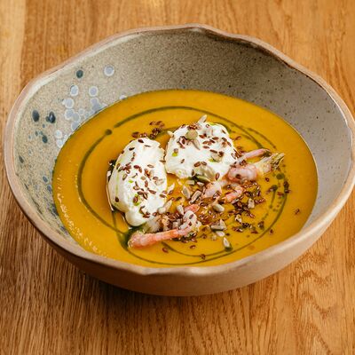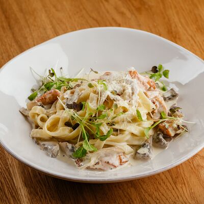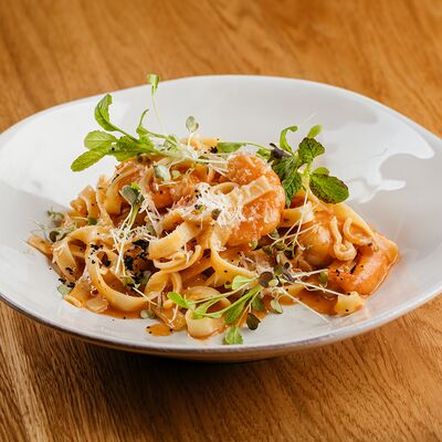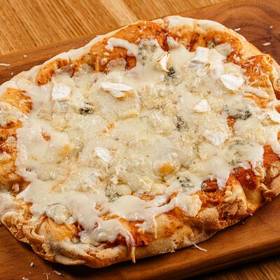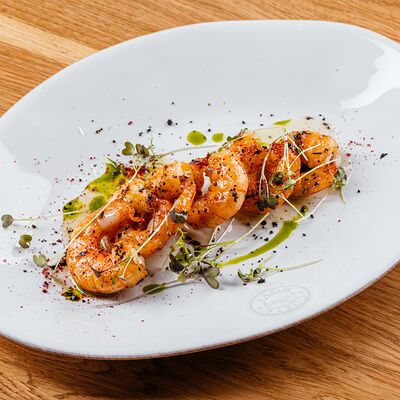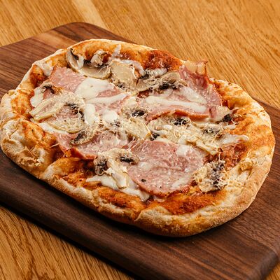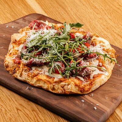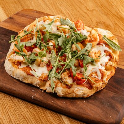 Томатный соус, тигровые креветки, томаты черри, руккола, моцарелла, пармезан (20-25 см)