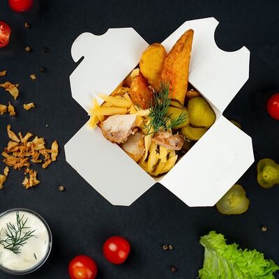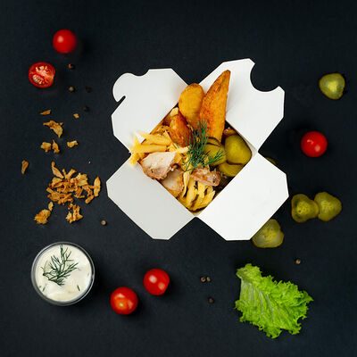 Курица в домашнем маринаде, соус терияки, томаты, огурцы, витаминный салат. Добавки на выбор