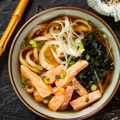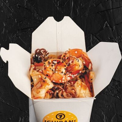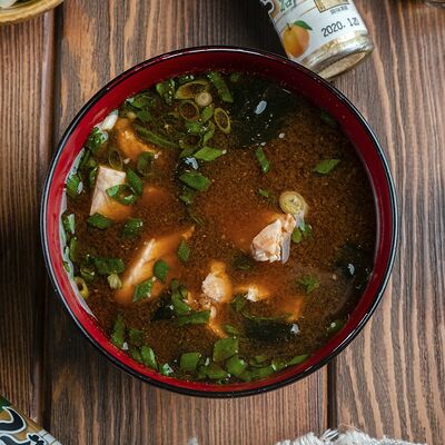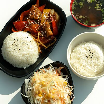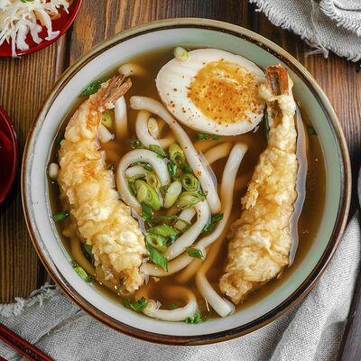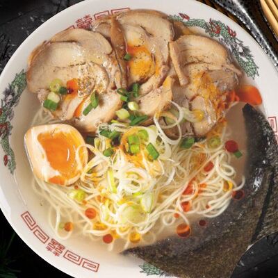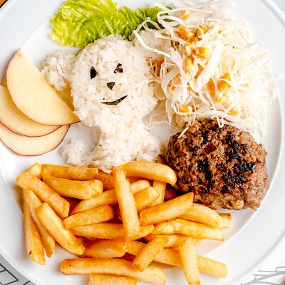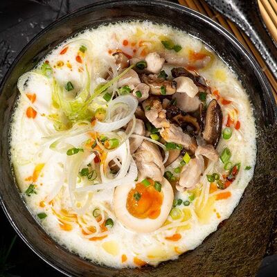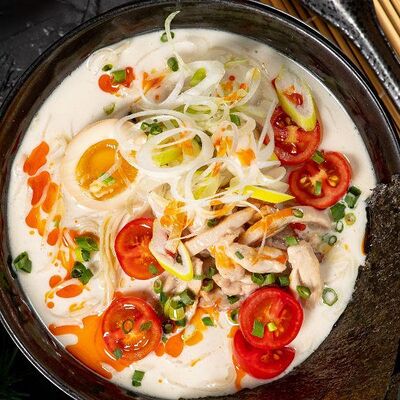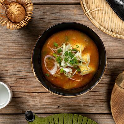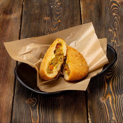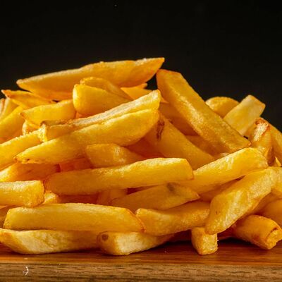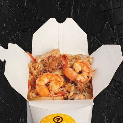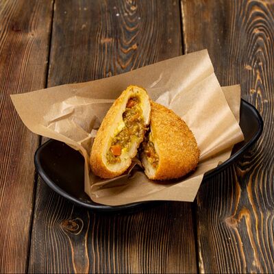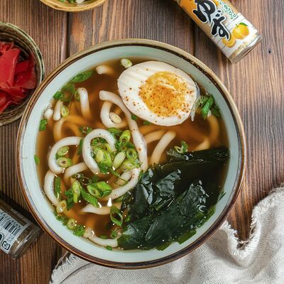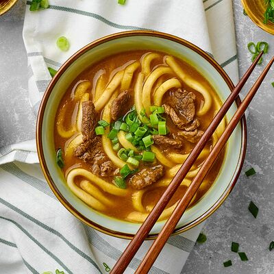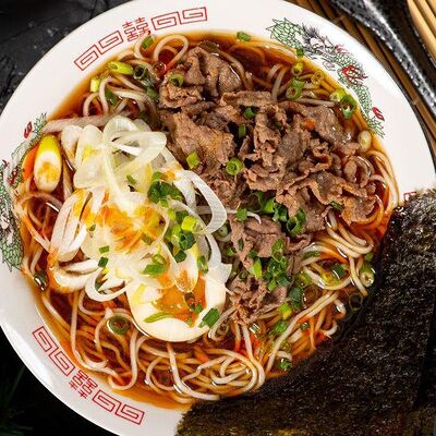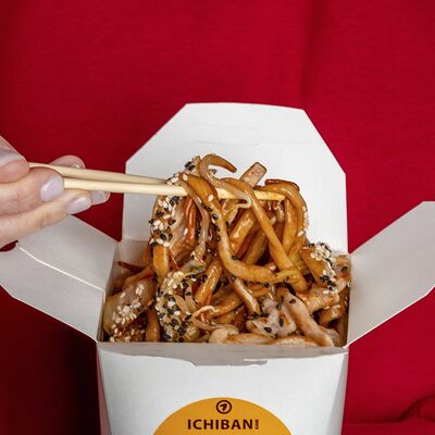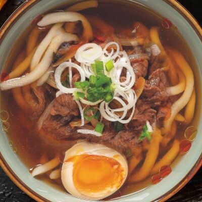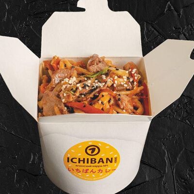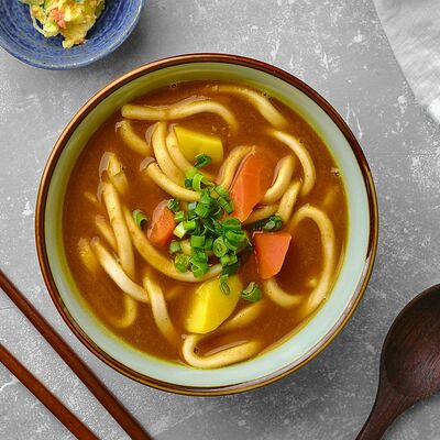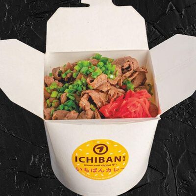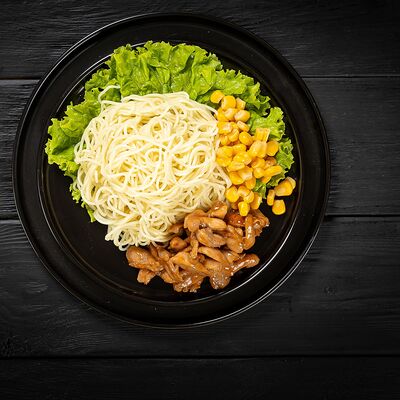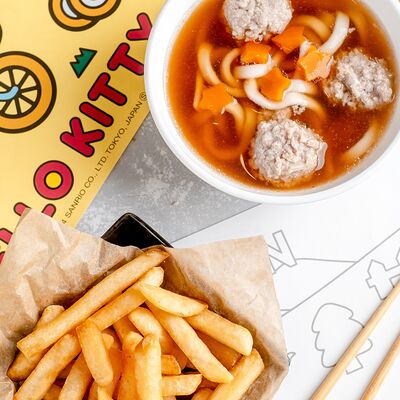 Пшеничная лапша с бульоном, говяжьими фрикадельками и морковкой. Подается с порцией картофеля фри