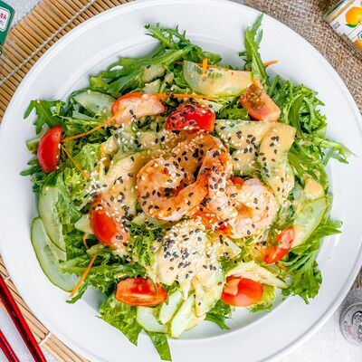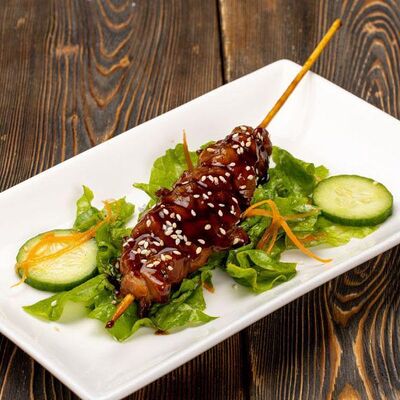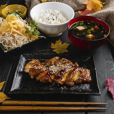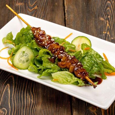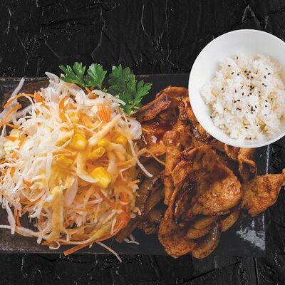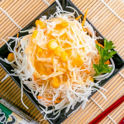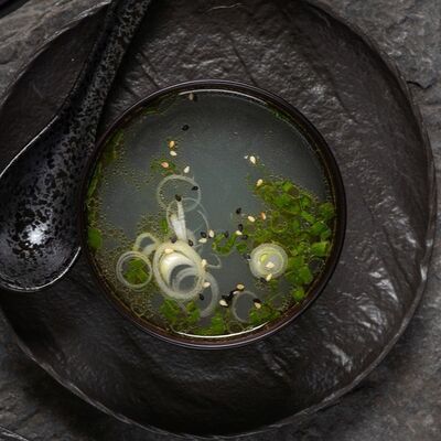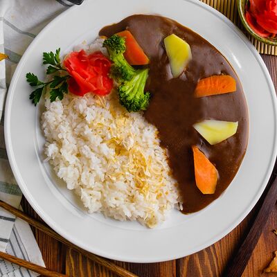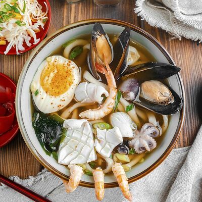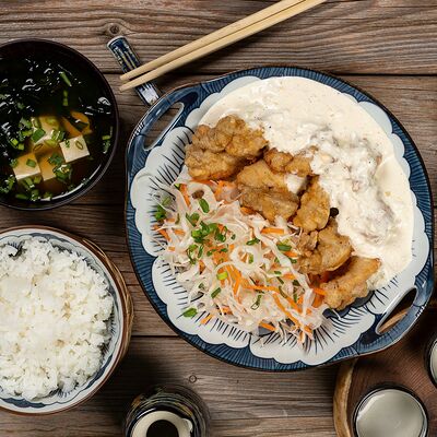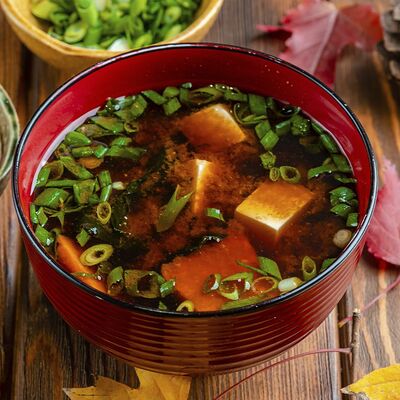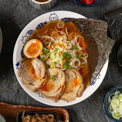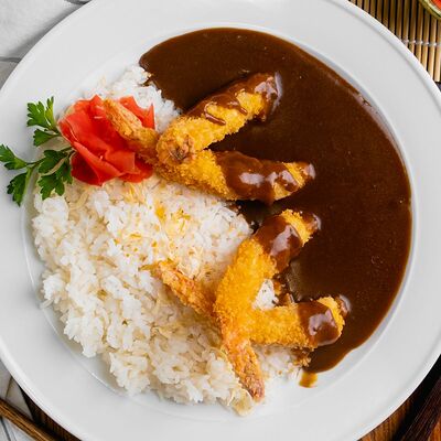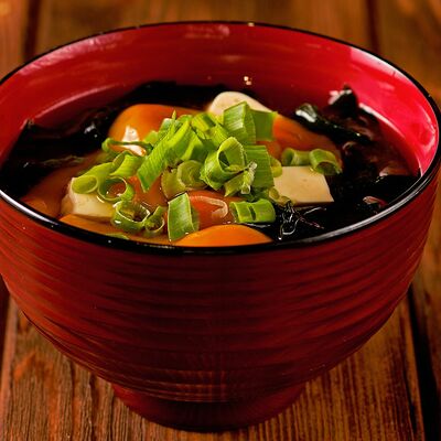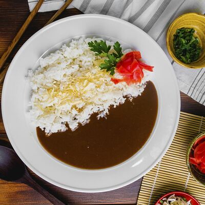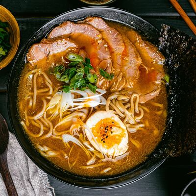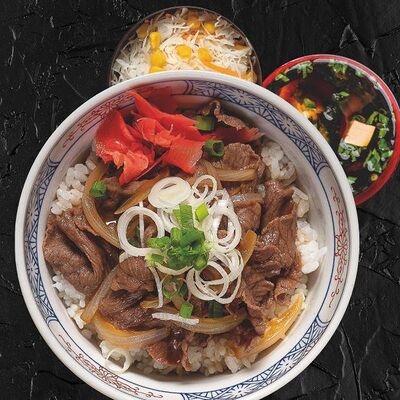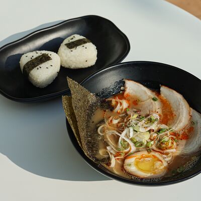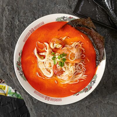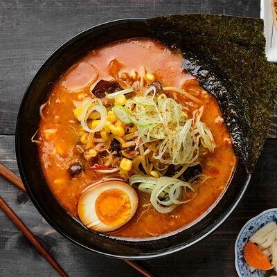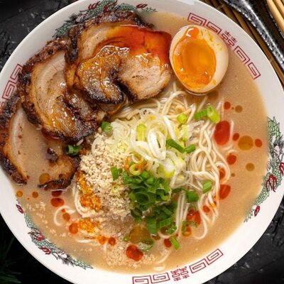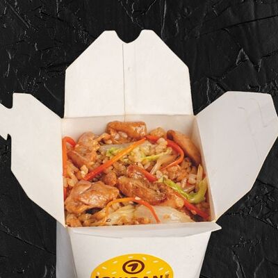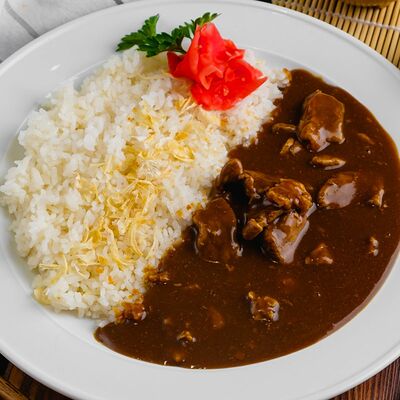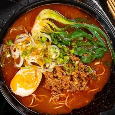 Пшеничная лапша с бульоном, говяжьими фрикадельками и морковкой. Подается с порцией картофеля фри