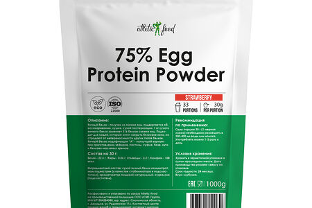 Яичный белок имеет сбалансированный аминокислотный состав, необходимый для роста и укрепления мышечной массы. Добавка практически не содержит жиров и углеводов, поэтому подходит для приема во время сушки. Купить яичный белок Atletic Food рекомендуется в качестве основного источника протеина. Добавка изготавливается из пищевых яиц методом фильтрации и последующей сушки. Яичный протеин по мнению многих исследователей считается лучшим в плане скорости усвоения, анаболической активности, степени насыщения мышц. Он на 30% состоит из аминокислот с разветвленной цепью (BCAA). Белок усваивается быстрее казеина, но медленнее сывороточного протеина. Это делает добавку наиболее подходящей в период набора массы и похудения. Для изготовления 1 кг протеина используется около 318 свежих яиц. Что дает прием 75% Egg Protein Powder: ускоренный рост мускулатуры; быстрое восстановление после тренировок; повышение выносливости и физической силы; укрепление мышц; уменьшение подкожного жира; укрепление иммунитета. Применение: Для приготовления протеинового коктейля смешайте 30 г добавки (1 мерная ложка) и 250-350 мл воды/молока. Для получения однородной консистенции перемешивайте ингредиенты в шейкере или при помощи блендера. Принимайте до и после тренировки.