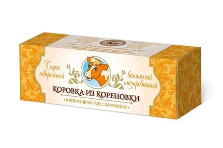Сырок творожный глазированный Коровка из Кореновки в белом со вкусом апельсина шоколаде с цукатами 23% доставка