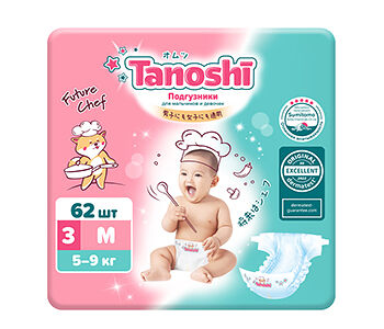 Подгузники детские размер M 5-9 кг, Tanoshi, 62 шт доставка