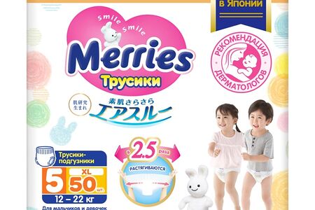 Трусики-подгузники для детей Merries, размер XL (12–22 кг), 50 шт доставка