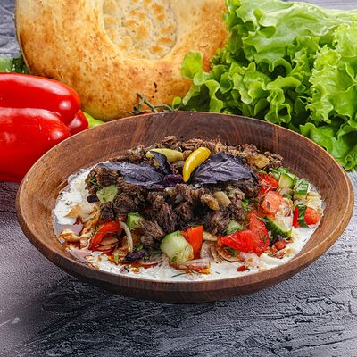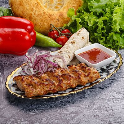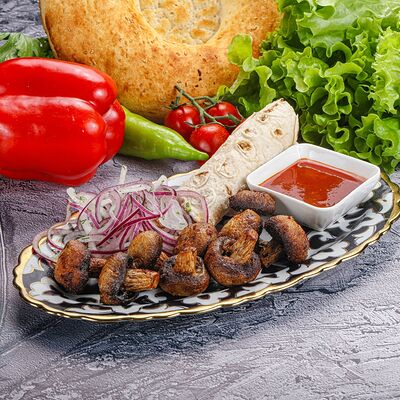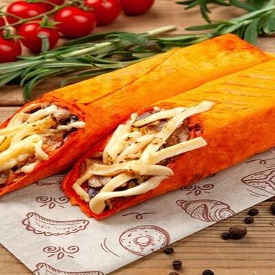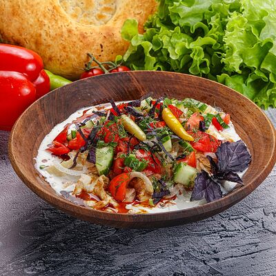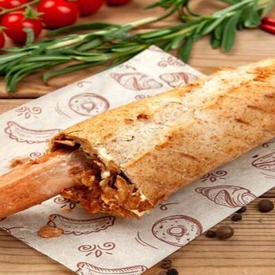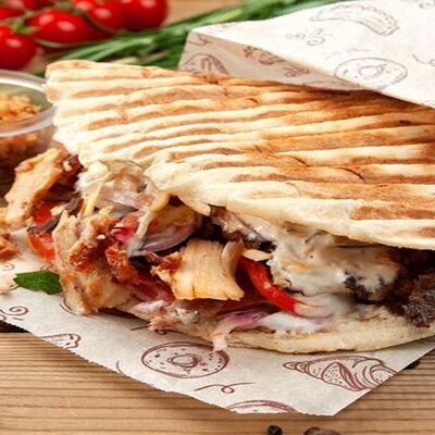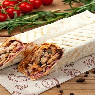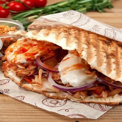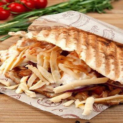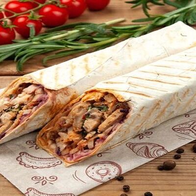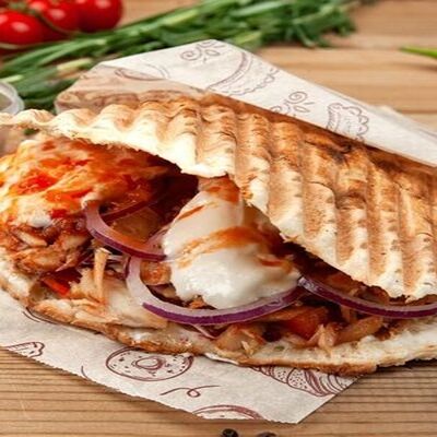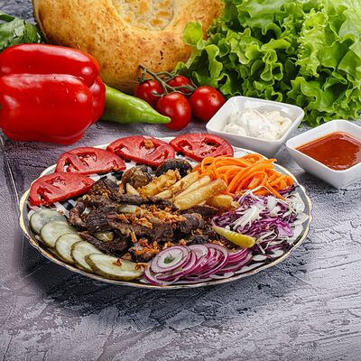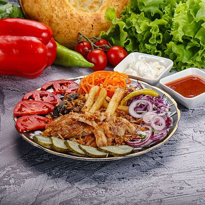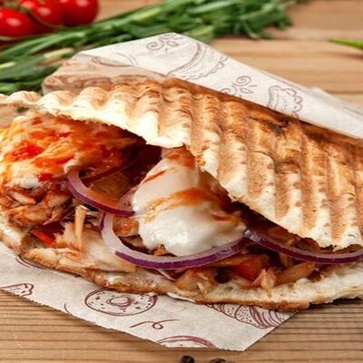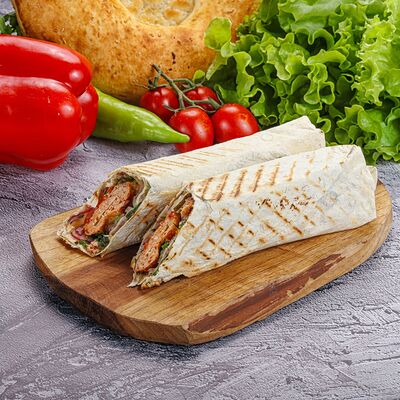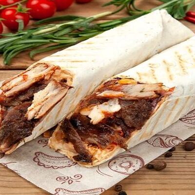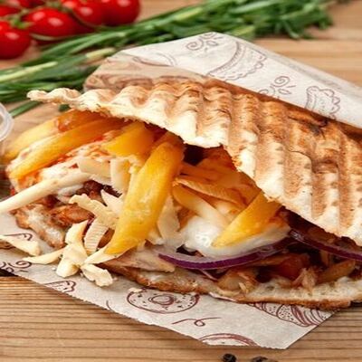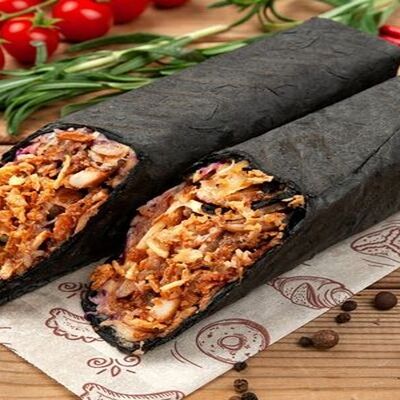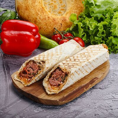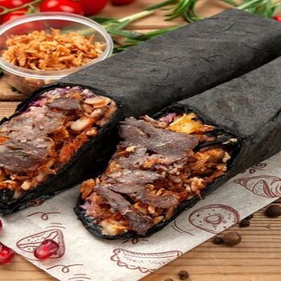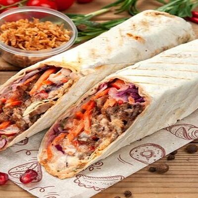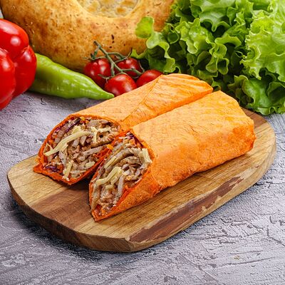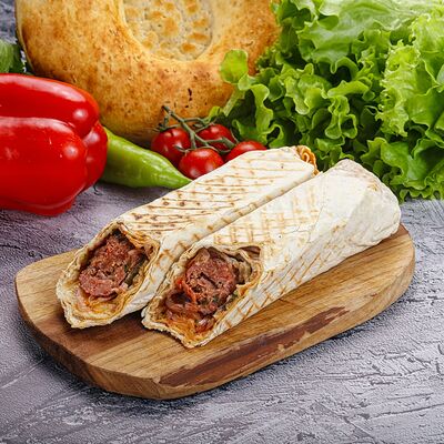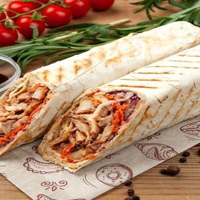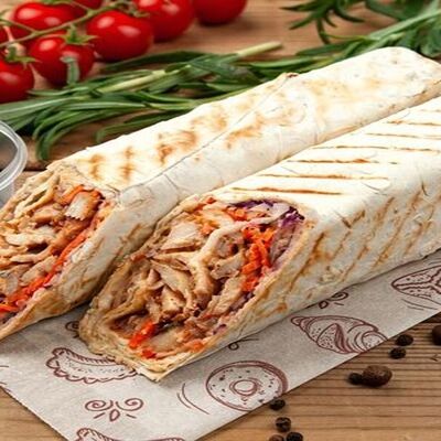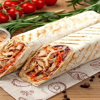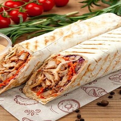 Нежное филе курицы и телятины, молодая краснокочанная и белокочанная капуста, корейская морковь, ялтинский лук, солёные огурцы, свежие помидоры, свежие огурцы, красный турецкий соус, фирменный чесночно-йогуртовый соус