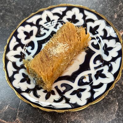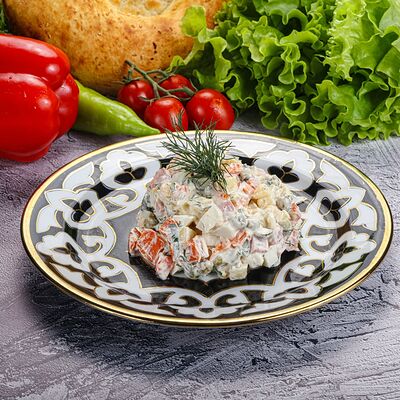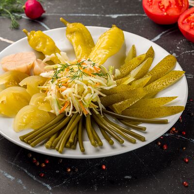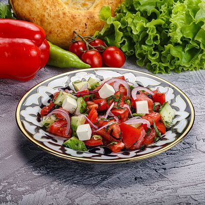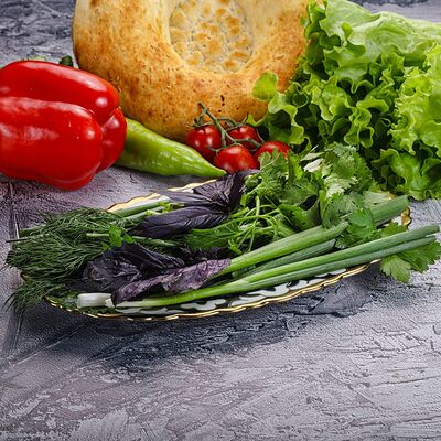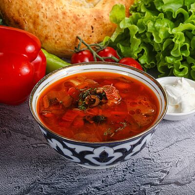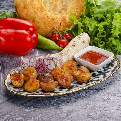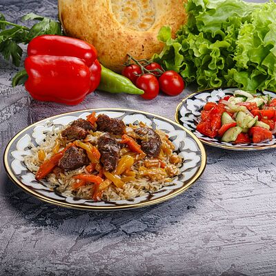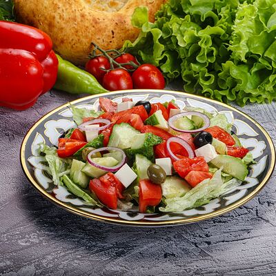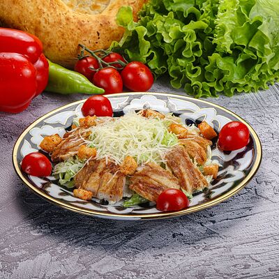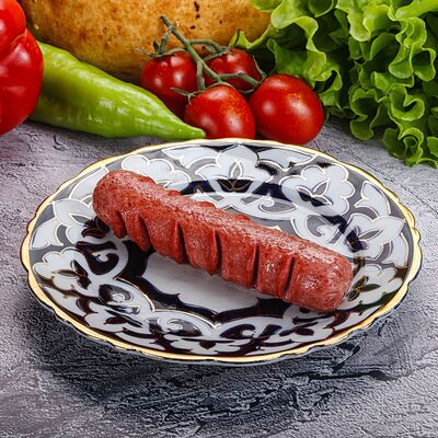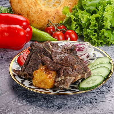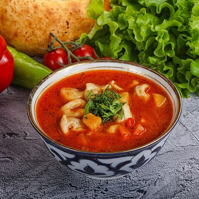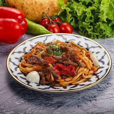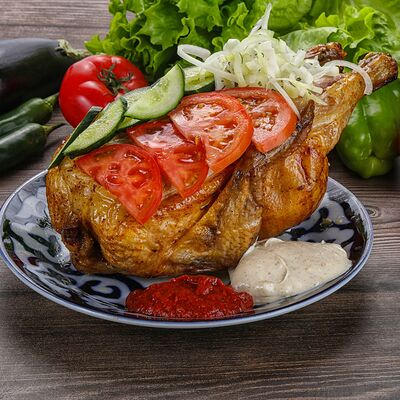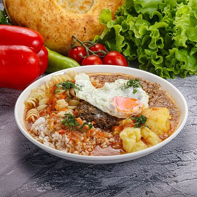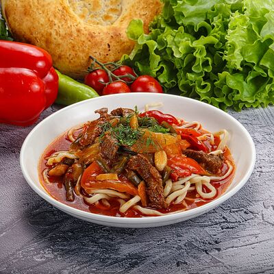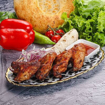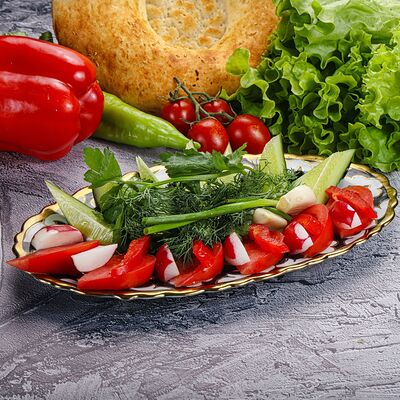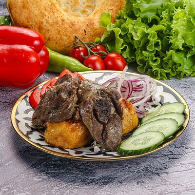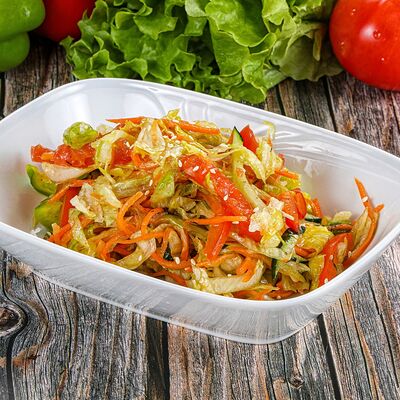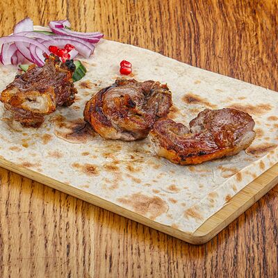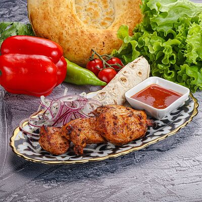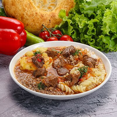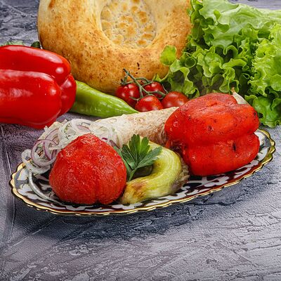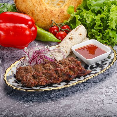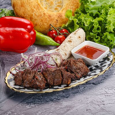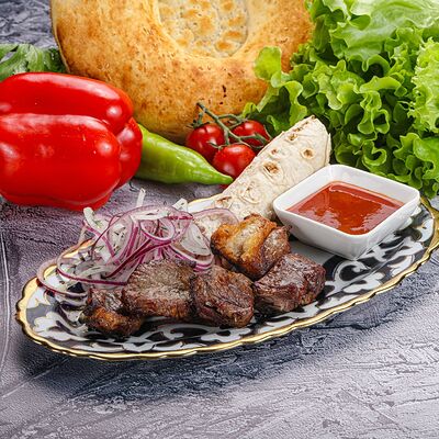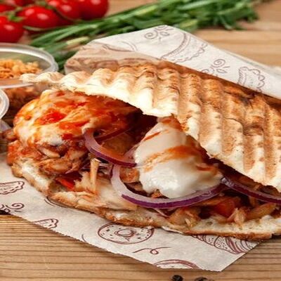 Нежное филе курицы и телятины, молодая краснокочанная и белокочанная капуста, корейская морковь, ялтинский лук, солёные огурцы, свежие помидоры, свежие огурцы, красный турецкий соус, фирменный чесночно-йогуртовый соус