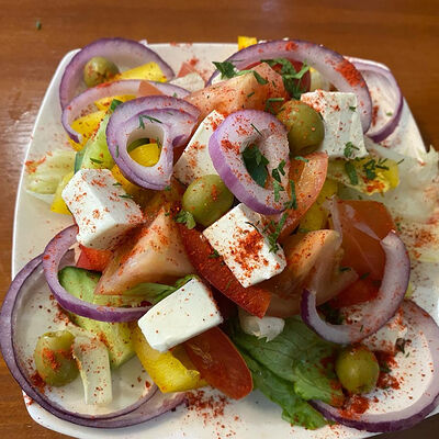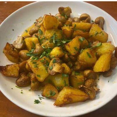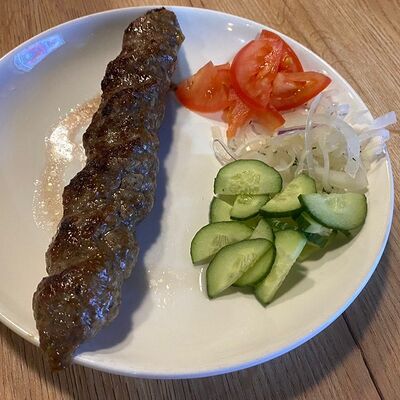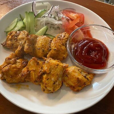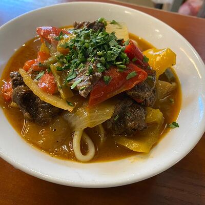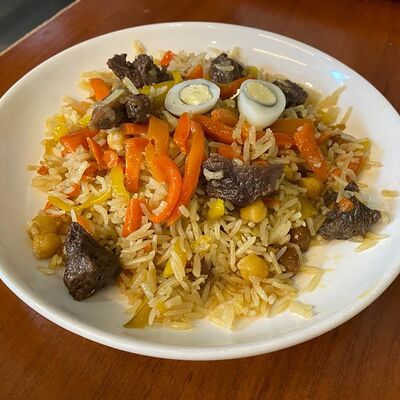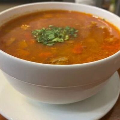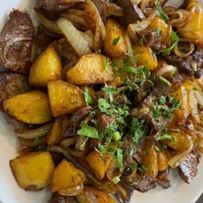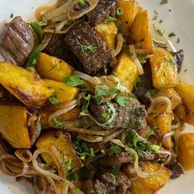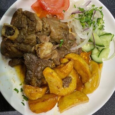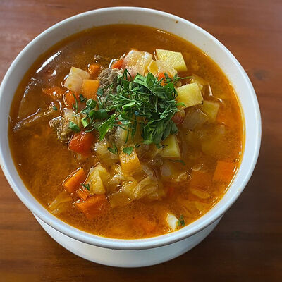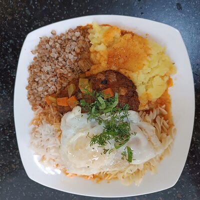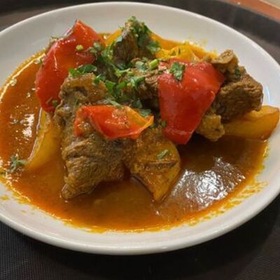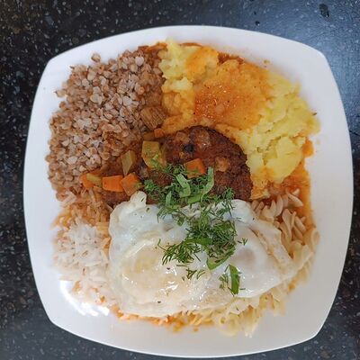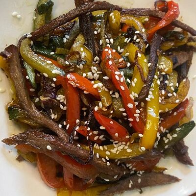 Мясо, морковь, перец болгарский красный, приправы. Гарнир на выбор: гречка, пюре, рис, макароны