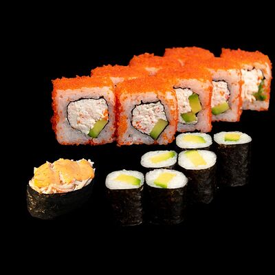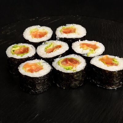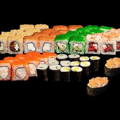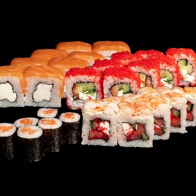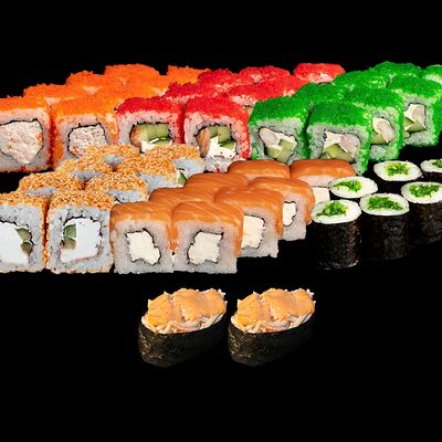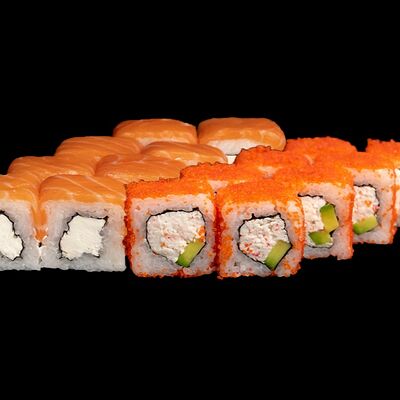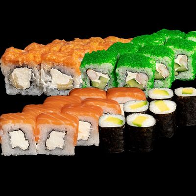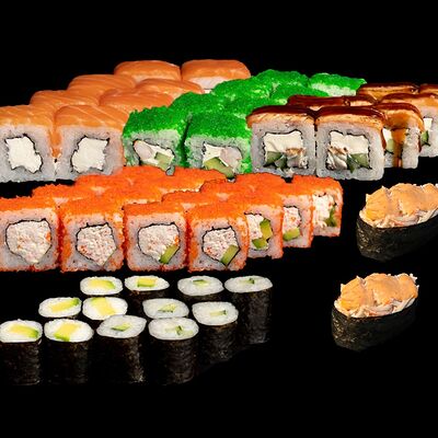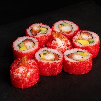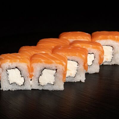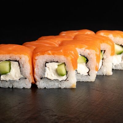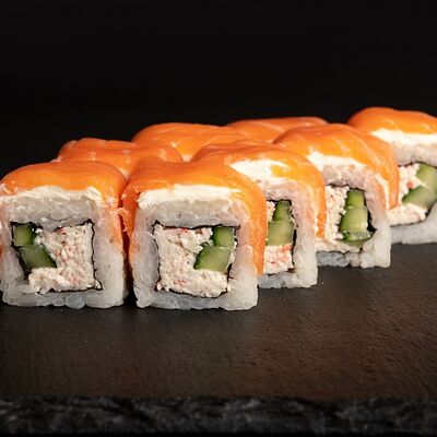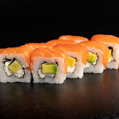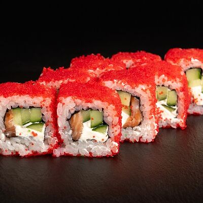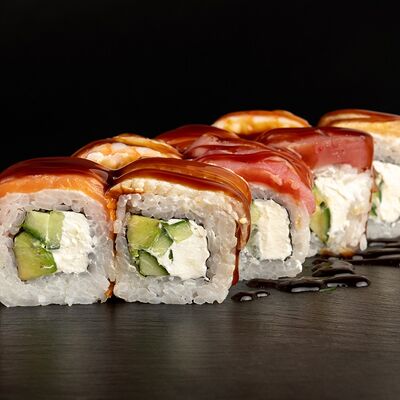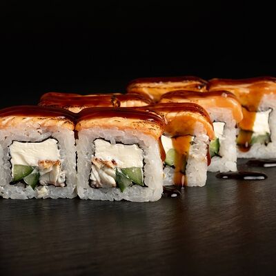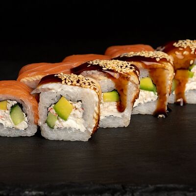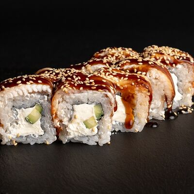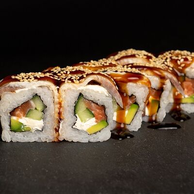 Угорь, лосось, творожный сыр, авокадо, огурец, соус унаги, кунжут, рис, нори