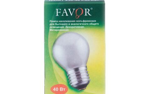 Вольфрамовая лампа накаливания Favor подойдет для бытового и аналогичного общего освещения. Матовая колба выполнена в форме шарика. Лампочка мощностью 40 Вт оснащена цоколем E27. Излучает теплый свет.