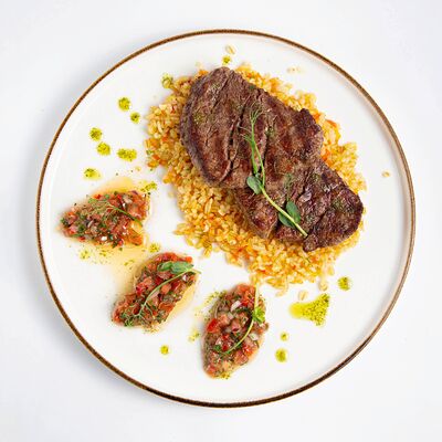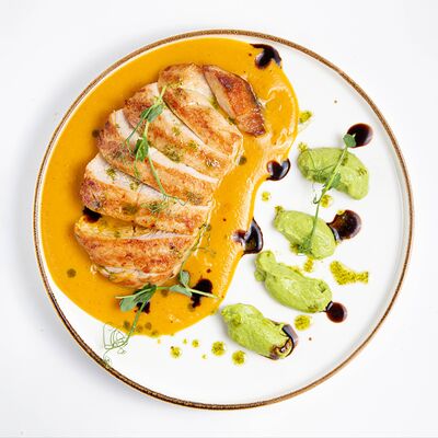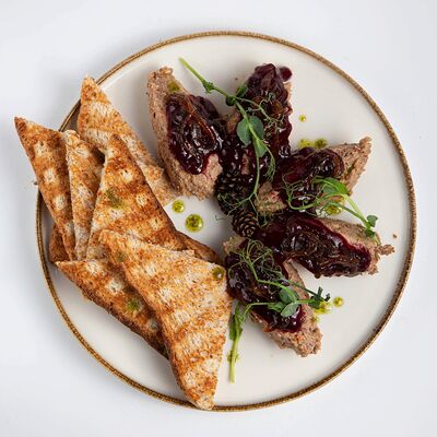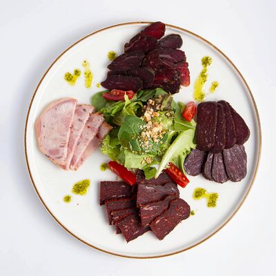 Рулет из мяса фазана, филе грудки куриной (копченое), вырезка говяжья, перец болгарский, морковь, лук репчатый, чеснок, картофель, маслины, томатная паста