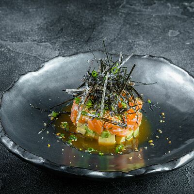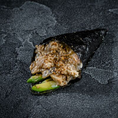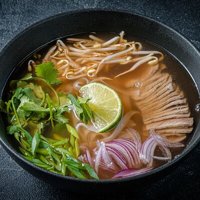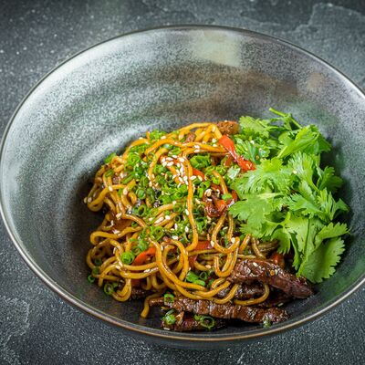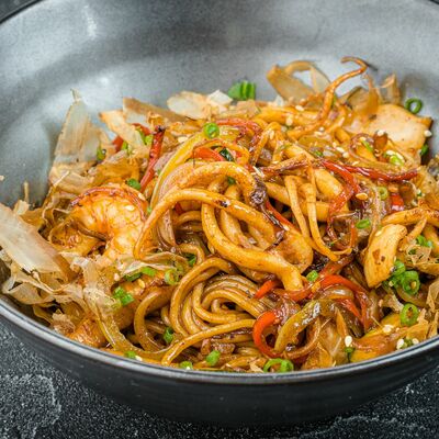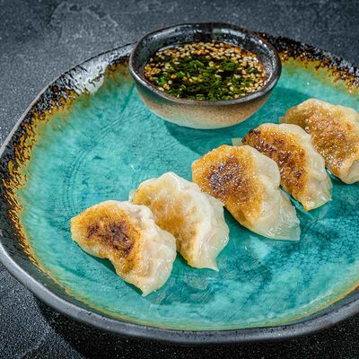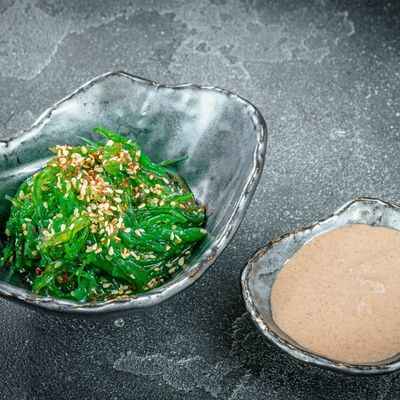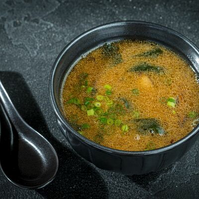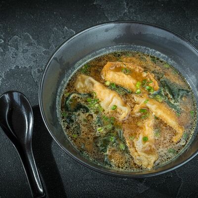 Бульон мисо, вонтоны с креветками, грибы шиитаке, водоросли вакаме, сыр тофу, лук-порей, зеленый лук