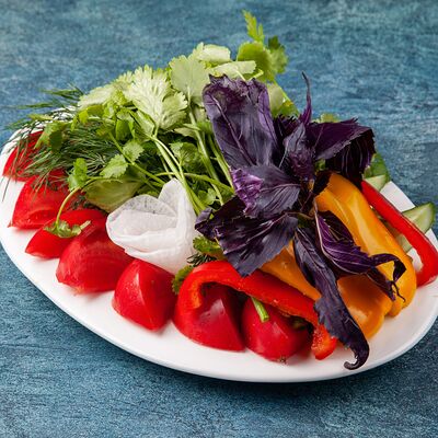 Микс из свежих овощей (листья салата, маслины, оливки, красный лук и орегано), сыр фета