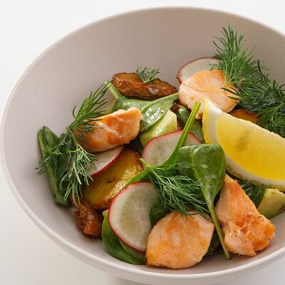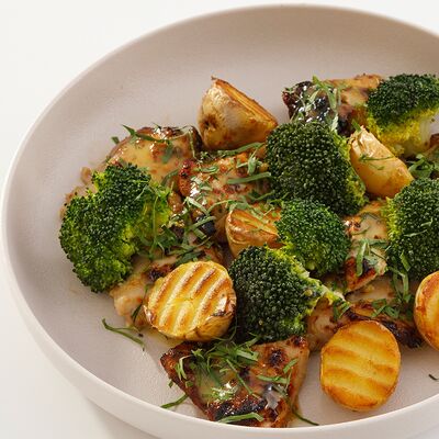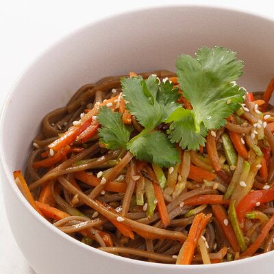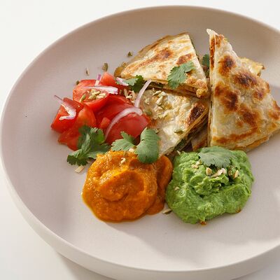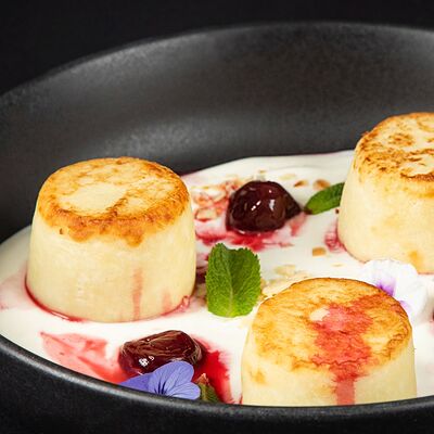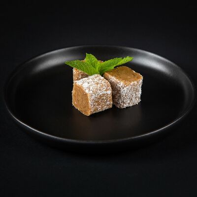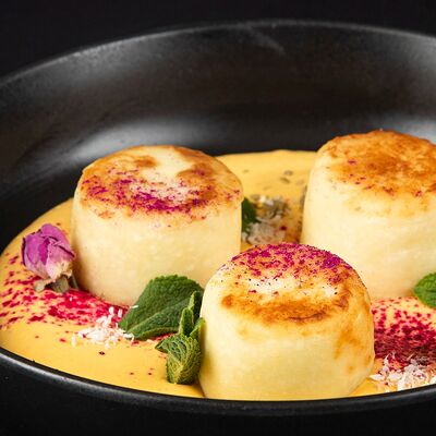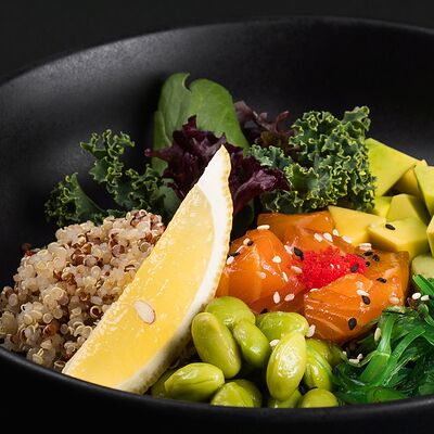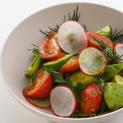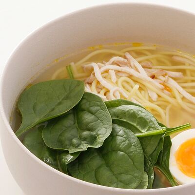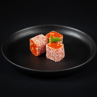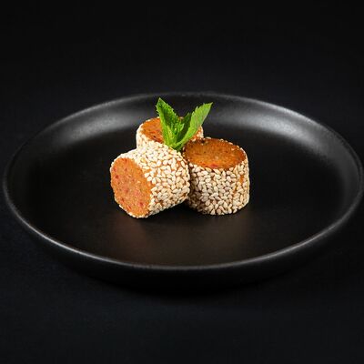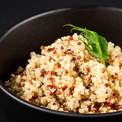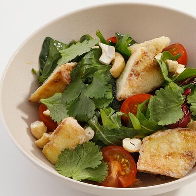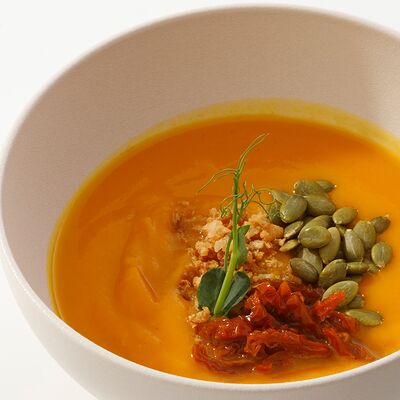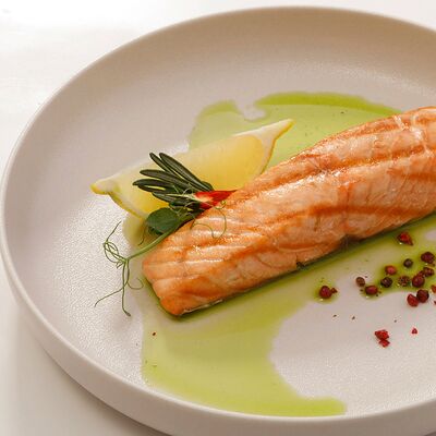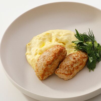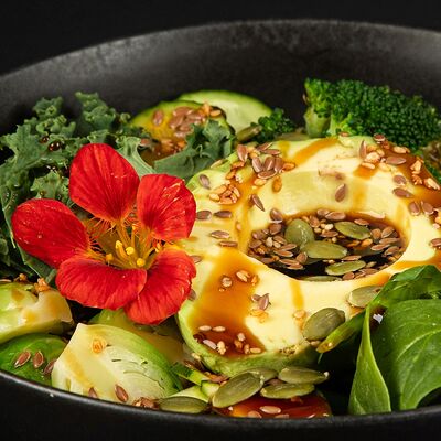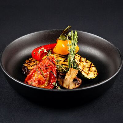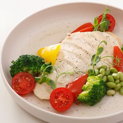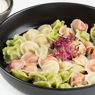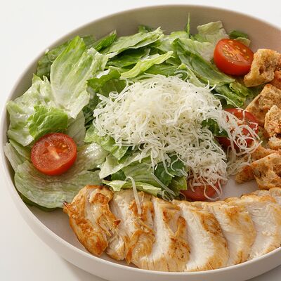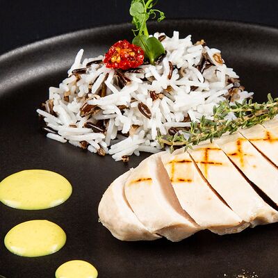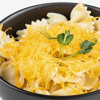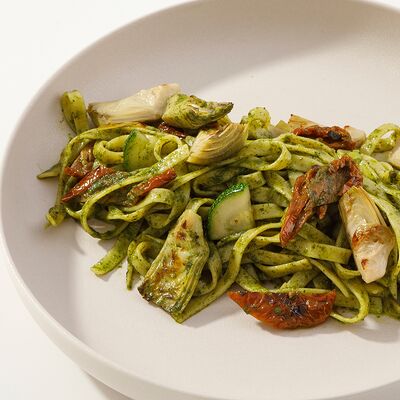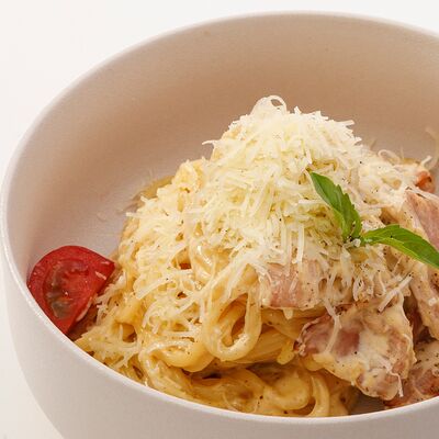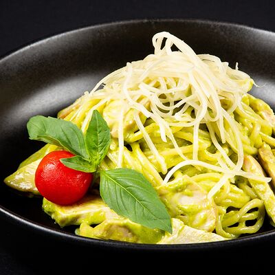 Спагетти из твердых сортов пшеницы, филе куриное, сливки, томаты черри, соус песто, орешки кедровые