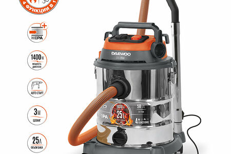 "Пылесос DAEWOO DAVC 2514S по-настоящему универсальная техника. Убирайте цементную пыль, стружку и другой мусор в режиме сухой уборки. Собирайте воду с любых поверхностей в режиме всасывания и откачки воды. Удаляйте загрязнения из труднодоступных мест и продувайте инструменты в режиме обратного выдува. Чистите камины и грили в режиме сбора золы и неостывших углей. Пригодится и в профессиональной сфере, и в быту.Область примененияСухая уборка; классический режим работы для сбора сухой пыли и строительного мусора.Сбор и откачка воды; эффективная откачка и сбор воды с любой поверхности.Сбор золы и не остывших углей; отлично подойдет для очистки каминов, грилей и т.д.Выдувание; мощный поток выдуваемого воздуха значительно облегчает очистку труднодоступных местПреимущества:- Бак из нержавеющей стали - устойчив к коррозии и механическим воздействиям. Благодаря стойкости к высоким температурам он отлично подходит для сбора золы и не остывших углей. Объем бака 25 л.- Алюминиевый огнеупорный шланг - гибкий алюминиевый всасывающий шланг в полимерной оболочке не боится высоких температур и предназначен для сбора золы и неостывших углей.- Огнеупорный предварительный фильтр - удерживает крупные частицы пыли и золы в баке. Фильтр выполнен из огнеупорного материала, выдерживающего высокие температуры.- HEPA+ (High Efficiency Particulate Air) высокоэффективная система фильтрации воздуха состоит из 2-х частей: предварительный фильтр для удержания цементной пыли и HEPA фильтр, для удержания самых мелких частиц.- Встроенная розетка позволяет подключать к нему электроинструменты мощностью до 2 кВт. Автоматическое включение пылесоса при начале использования инструмента и отключение с задержкой для удаления грязи из шланга.- Функция всасывания и откачки воды позволяет эффективно собирать жидкость с любого покрытия в объеме до 17 - 18 литров. Автоматическая остановка всасывания для предотвращения попадания жидкости в двигатель.- Эффективно удаляет засоры в сливах раковин, ванн и душевых кабин, без необходимости разбора и применения химикатов. Специальная форма обеспечивает высокую степень разряжения и подходит для всех типов шлангов от 32 до 38 мм.Отверстие, расположенное в нижней части бака, облегчает слив собранной загрязненной жидкости без необходимости поднимать и переворачивать пылесосФункция обратного выдувания 3000 л/мин позволяет очистить рабочее место от опилок и стружки, сдуть листву с дорожек или прочистить водосток или канализацию.Комплект поставкиПылесосФильтр тонкой очистки (HEPA)Огнеупорный фильтр-мешок грубой очисткиПоролоновый фильтрВсасывающий шлангМеталлический всасывающий шланАлюминиевая трубкаТелескопическая штангаЩетка для сухой и влажной уборкиЩелевая насадкаЩелевая алюминиевая насадкаНасадка для прочистки сифоновРуководство по эксплуатацииГарантийный талон"