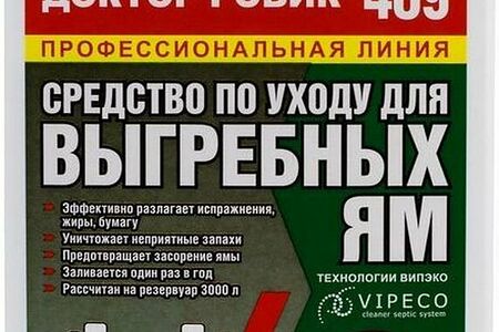 Средство по уходу за выгребными ямами 409 "Доктор Робик" в течение целого года нейтрализует неприятные запахи, расщепляет сложные органические соединения, в том числе бумагу, мочевину, белки и жиры, уменьшает объем сточных масс. Преимущества Средство без едких компонентов абсолютно безопасно для природы. Уникальная активная формула обеспечивает надежную работу накопительных канализационных систем на протяжении года. Препарат позволяет реже откачивать стоки и предотвращает засорения. Область применения "Доктор Робик" 409 используется для септиков, выгребных ям, дачных туалетов с открытым или герметичным дном. Одного флакона достаточно для обработки резервуара объемом три кубометра. Продукция под торговой маркой "Доктор Робик" производится компанией ВИПЭКО с применением собственных разработок и передового опыта в сфере биотехнологических препаратов.