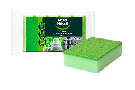 Губки для мытья посуды Master FRESH MAXI подходят для всех видов поверхностей, отлично впитывают воду и обильно пенятся.Губки Master FRESH прослужат долго, благодаря поролону высокой плотности, качественному абразивному слою и суперпрочной склейке слоев.