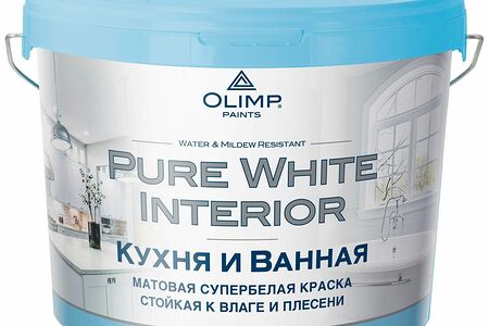 OLIMP Pure White Interior - супербелая матовая краска для отделки стен и потолков в ванной и на кухне. Для получения наилучшего результата покрытие рекомендуется наносить в два слоя на предварительно очищенное основание.