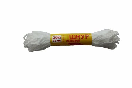 Шнур вязаный полипропиленовый – самый недорогой из всех видов производимых шнуров. Изготавливается на шнуровязальных машинах из высокопрочной мультифиламентной полипропиленовой нити.Используется в домашнем хозяйстве, а также для закрепления и упаковки груза, в садоводстве и рыболовстве . Толщина шнура: 3 мм. Длина шнура: 20 м.