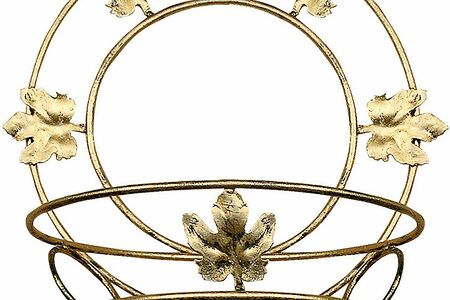 Подставка настенная для цветочного горшка представляет собой конструкцию из металла округлой формы в золотом исполнении. Изделие выполнено из тонких металлических прутьев, образующих подобие чаши. Конструкция дополнена декоративными элементами в виде кленовых листьев. Такая подставка устанавливается на стену при помощи крепежных деталей. Материал изготовления устойчив к механическим воздействиям, не подвержен коррозии. Высокое качество исходного материала обеспечивает изделию прекрасные износостойкие характеристики и долговечность.